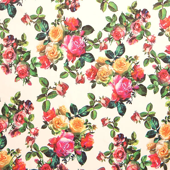 Create beautiful evening dresses and make a style statement with this Blushing Satin Fabric. Easy to work with, you can also create jackets and skirts and holds its body. Available in a Roses White design. Width of 148cm and for purchase by the metre. 73% Polyester, 25% Cotton, 2% Spandex.