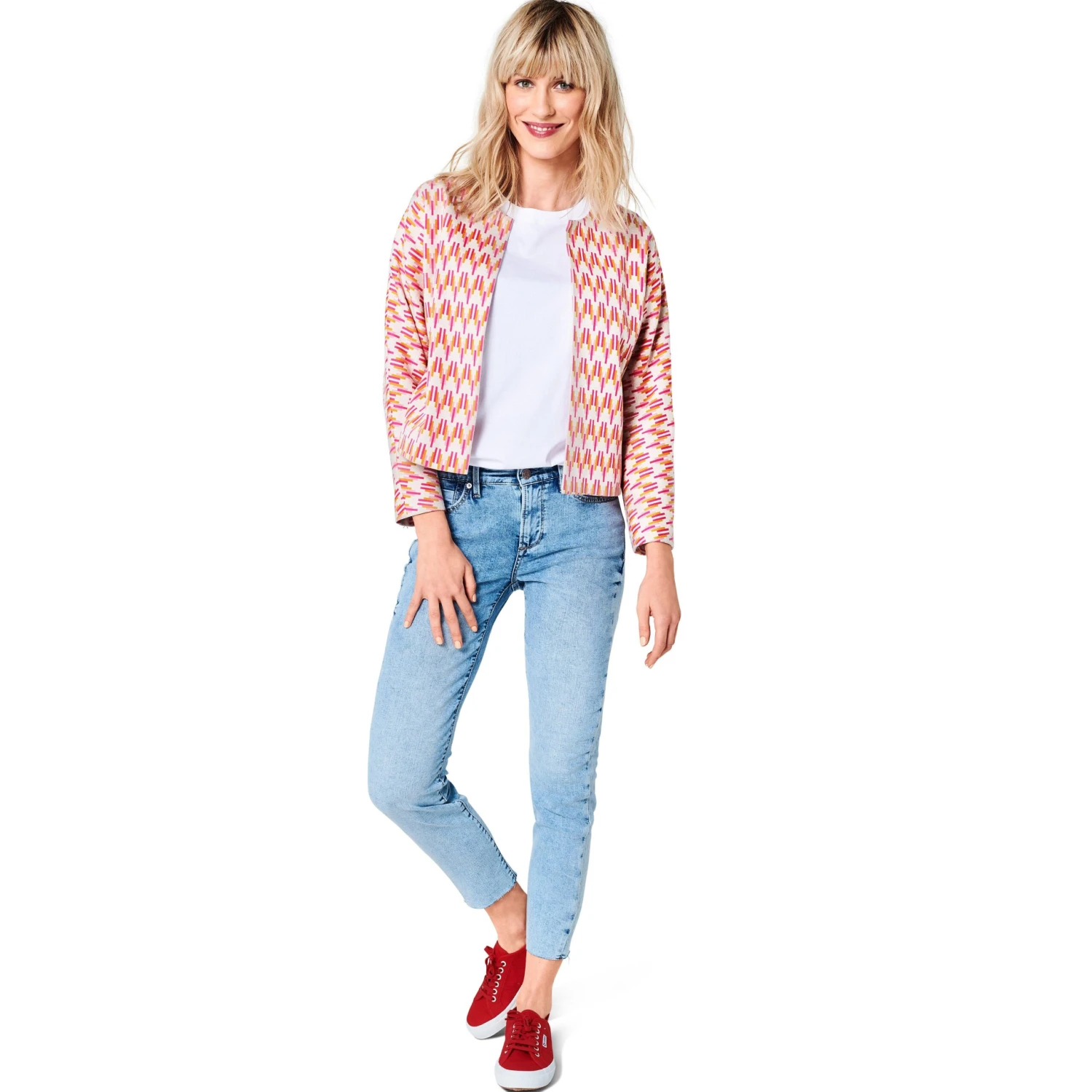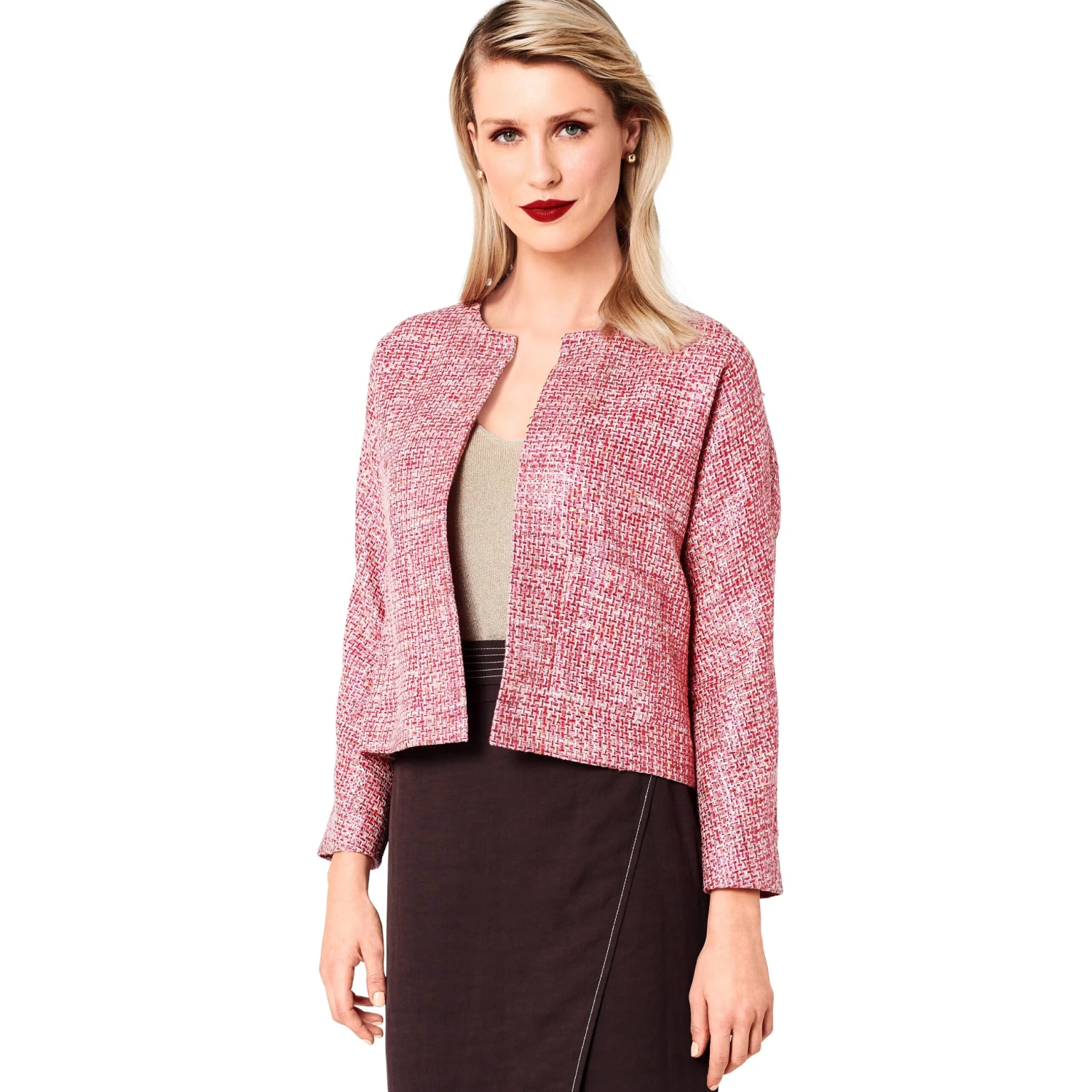 This collarless jacket is a true styling wonder! The classic cut with integral sleeves makes its best impact when made up in a structured fabric à la Chanel. Paired with jeans, a skirt or donned over a shift dress, this unlined jacket will always be appropriate.