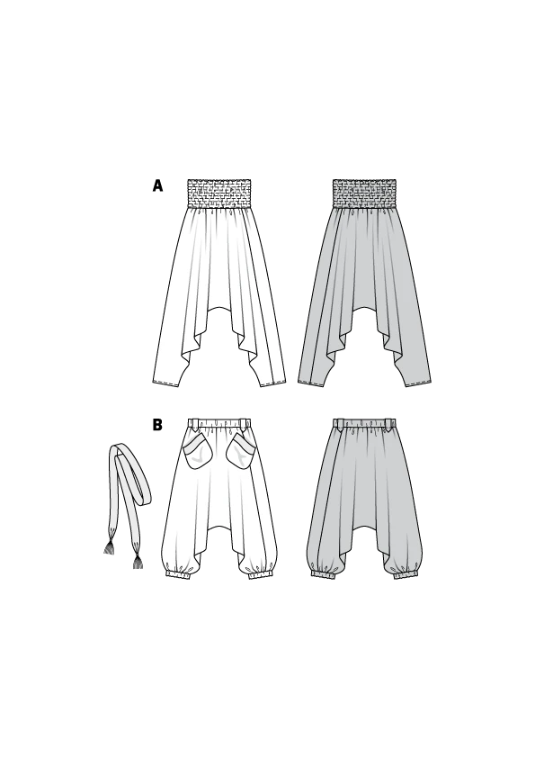 Great leisure pants/trousers in Ethno-Look with lots of leg room will put you in a vacation holiday mood. The legs of view A taper nicely toward the bottom and the waistband has elastic shirring. View B comes in 3/4-length with elastic leg bands, patch pockets and a tie belt made of trim.