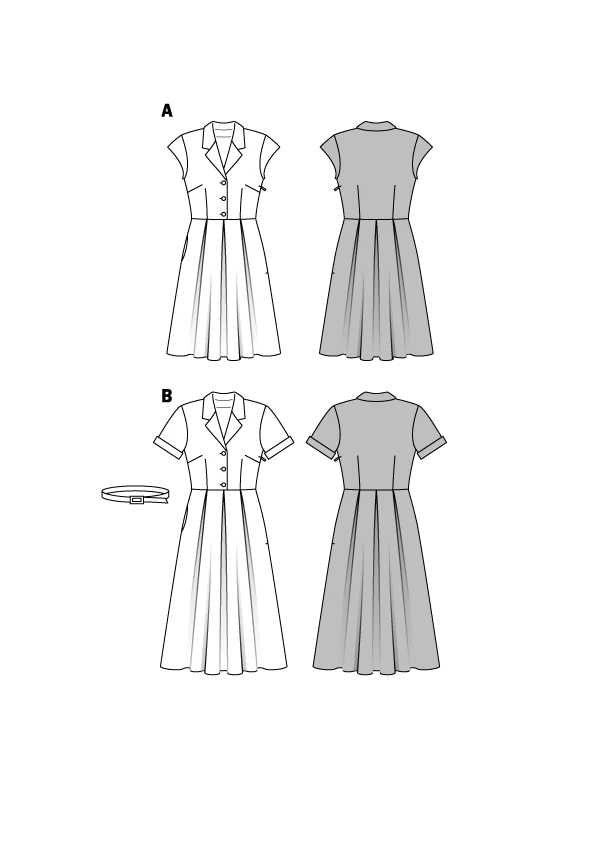- The pleated skirt can be made up in two lengths. View A has sleeve bands. View B has short, turned up sleeves and a narrow belt.