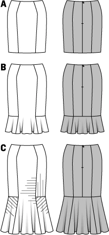 - Accentuated feminine touch of b and c with hem flounces. C is also suited for business with its tiny pinstripes.
