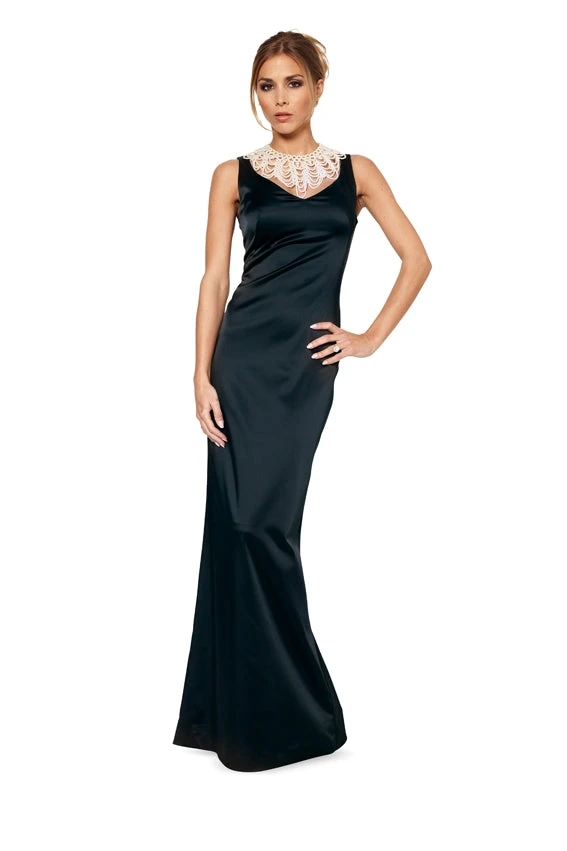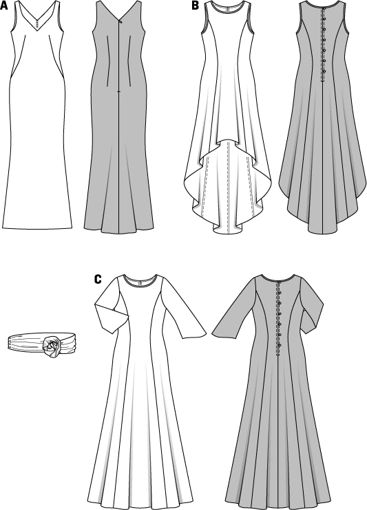 - Form-fitting evening gowns, shapely front and rear decollete, slightly flared the hem.