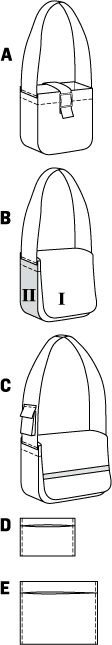 - 3 stylish shoulder bags: A with bar tack fastener, B made of two fabrics, with flap, C a little bigger with flap and compartment for your cell phone.