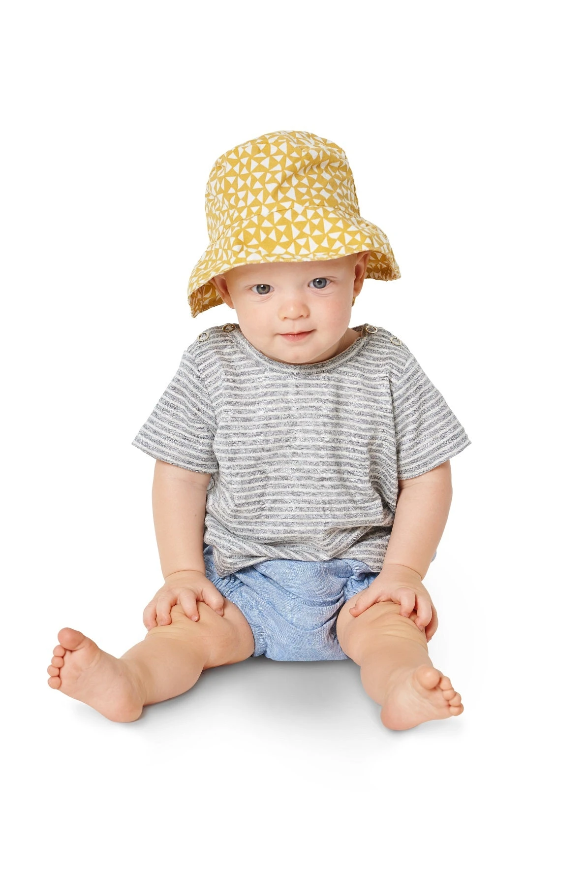 A comfortable and practical outfit for babies. Snap fasteners at the shoulders of the tops make them easy to put on and take off. The wide-leg panties can be made up with or without a bib.