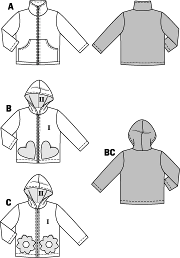 - Three smart jackets, alternatively with standing collar or hood. Boys will love variant a with the functional slant pockets.