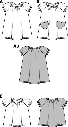 - Cute summer outfits, quick and easy to sew. The neck and raglan sleeves of the dress and the shirt are gathered with elastic casings.