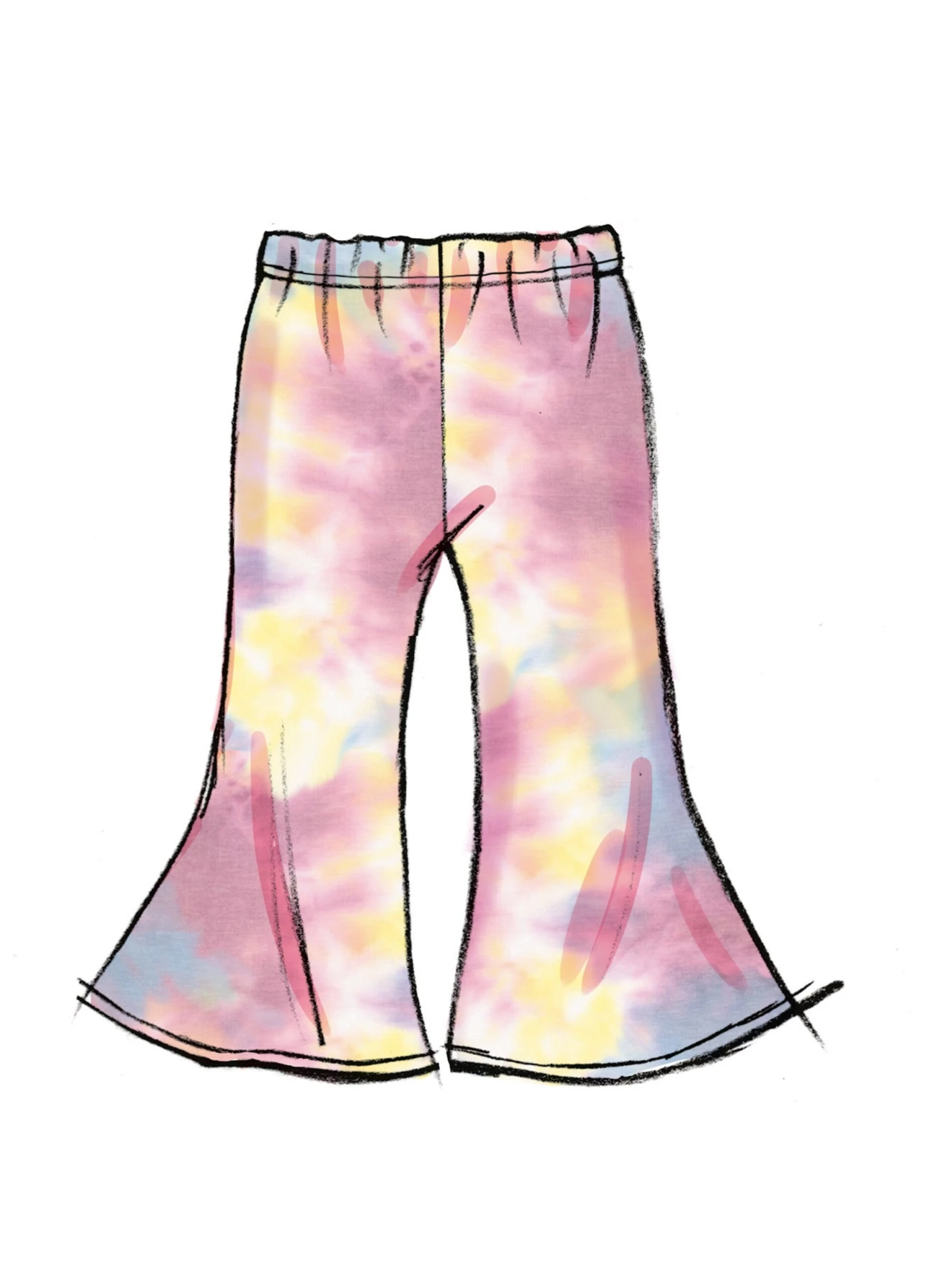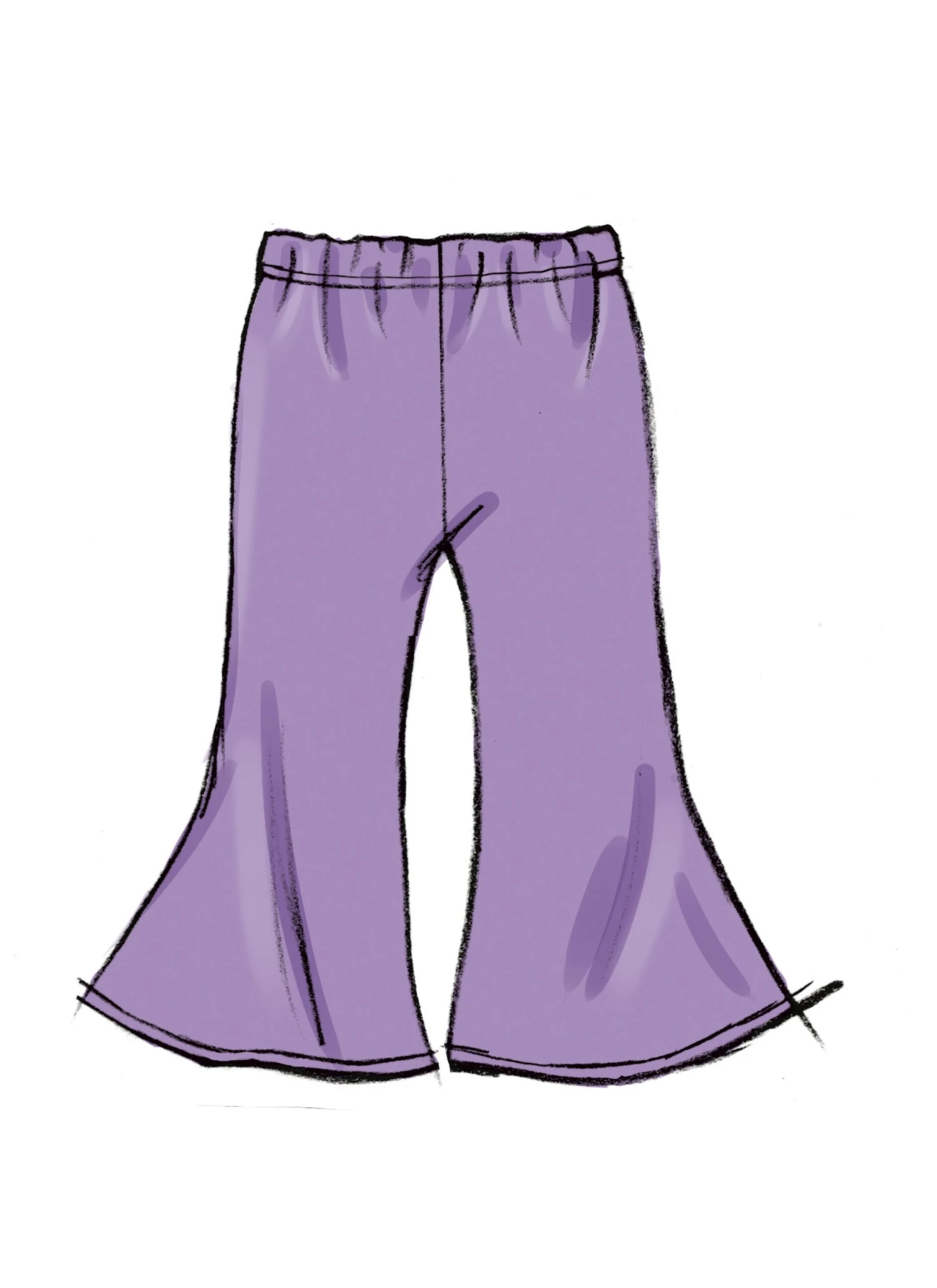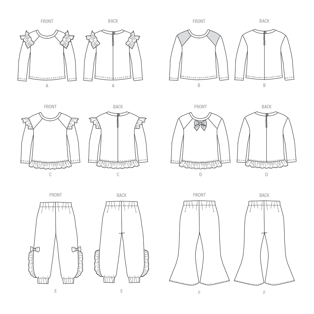•Top D has bow detail at front neckline. Pants E have elastic bands at ankles and ruffle and bow detail on sides of legs. Pants F are flared. Both pants have elastic waist.