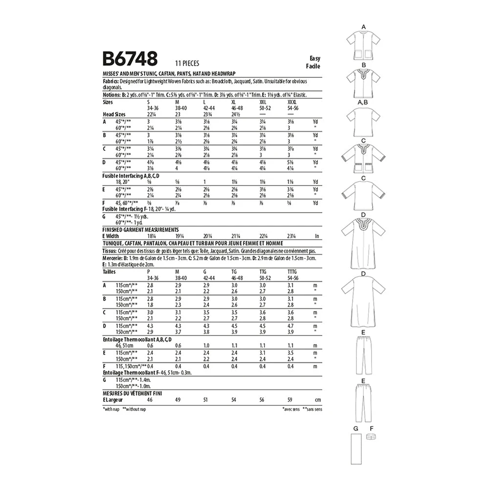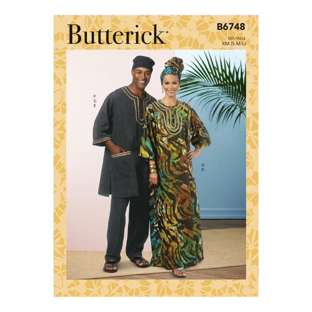 Butterick Pattern B6748 Unisex Tunic, Caftan, Pants, Hat And Head Wrap XM (S-M-L)
