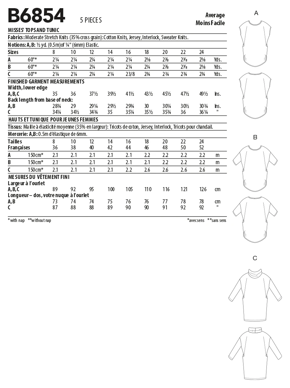 FABRICS: For Moderate Stretch Knits (35% Cross Grain): Cotton Knits, Jerseys, Interlock, Sweater Knits.