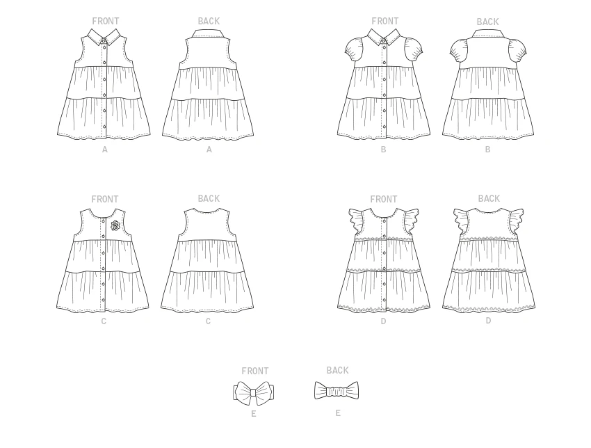 Button front, tiered dress is with and without collar and sleeve variations. Elastic headband has bow detail.