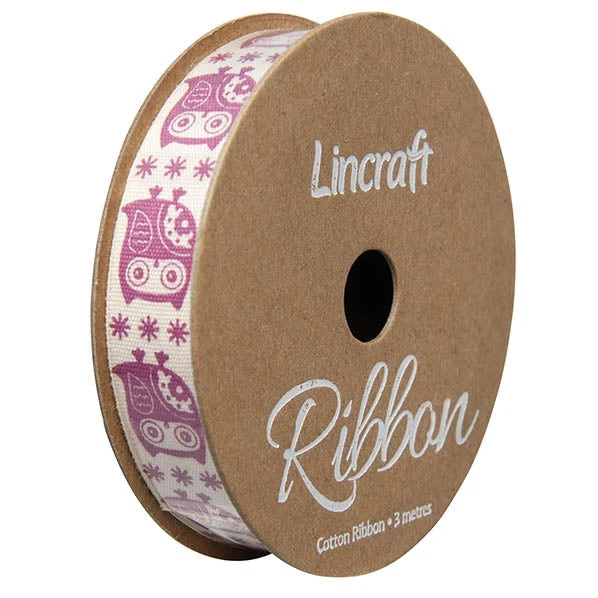 Cotton Ribbon, Fuchsia Owl- 15mm X 3m