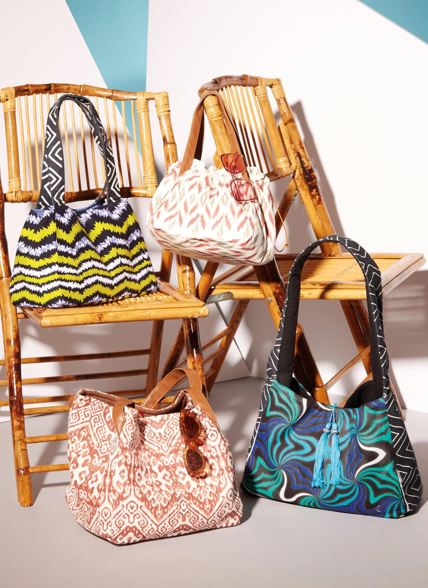 Soft, casual bags and totes have contrast handles and inside pocket. View A has a drawstring closure, view B has inside ties, view C has magnetic closure, and view D has a decorative tassel closure.
