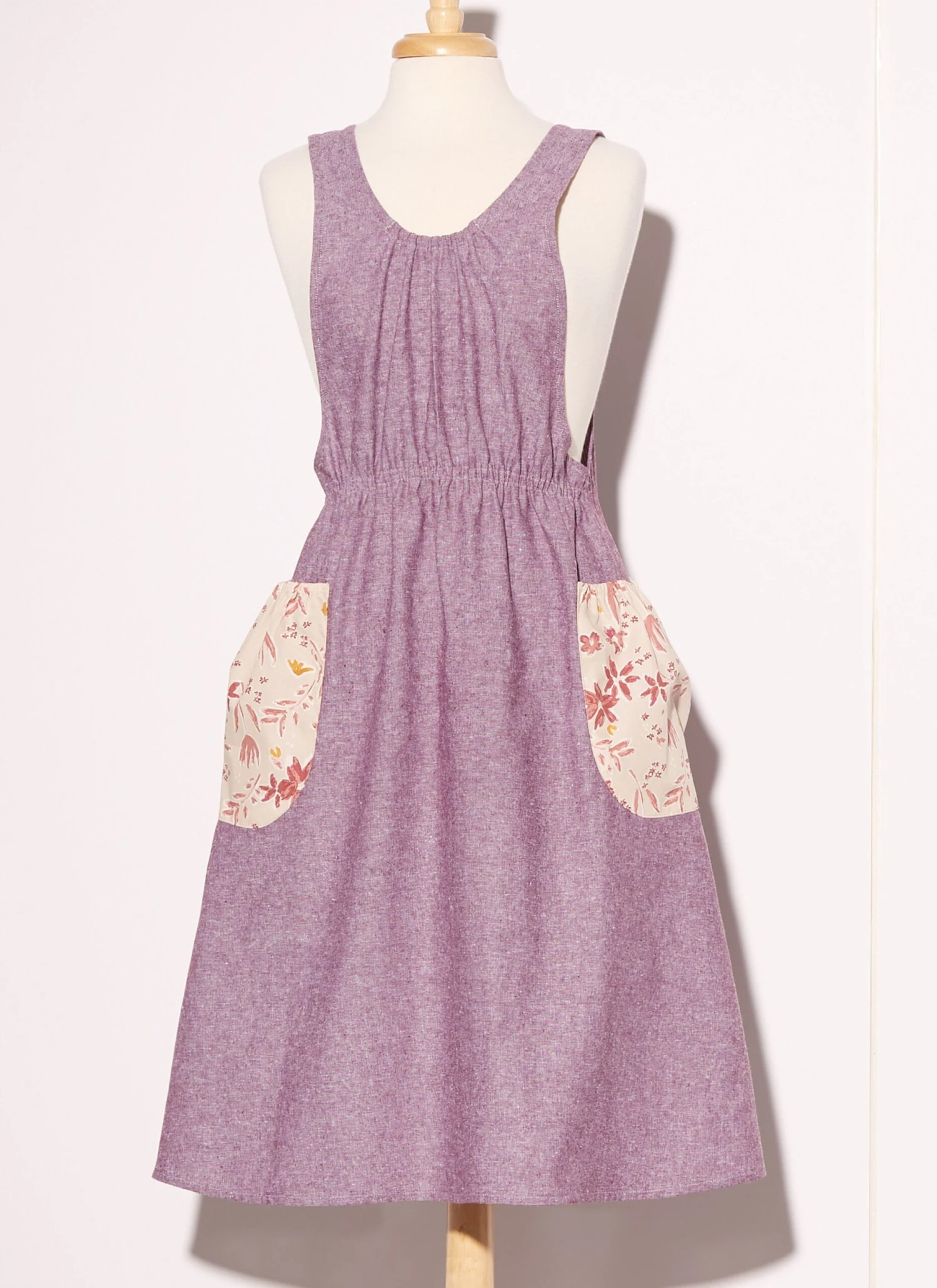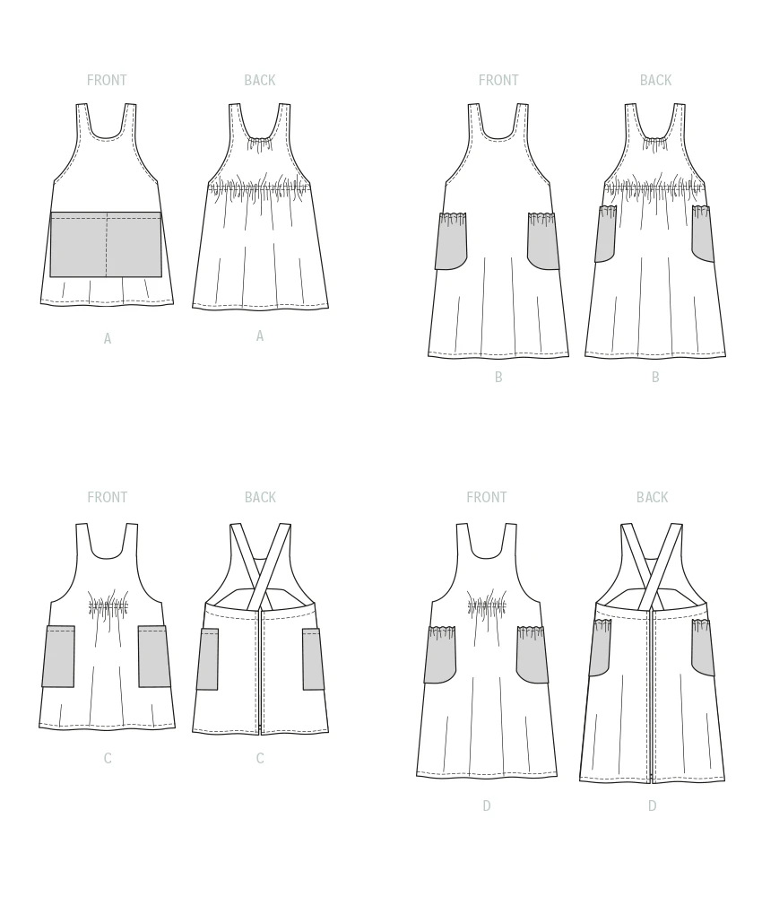 Views A and B have contrast side and front pockets with back elastic. Views C and D have contrast side pockets, elastic at the front waist and crossed shoulder straps in the back.