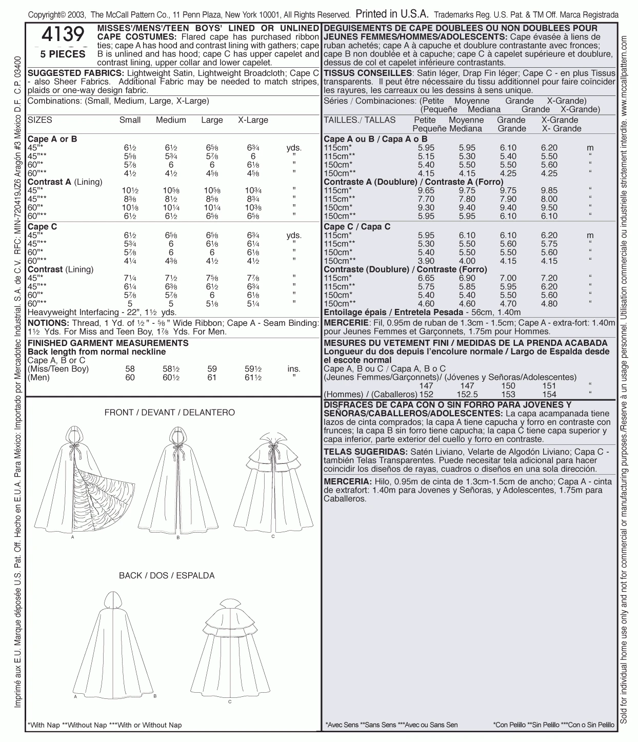 McCall’s Pattern M4139 Misses’/Men’s/Teen Boys’ Lined & Unlined Cape Costumes