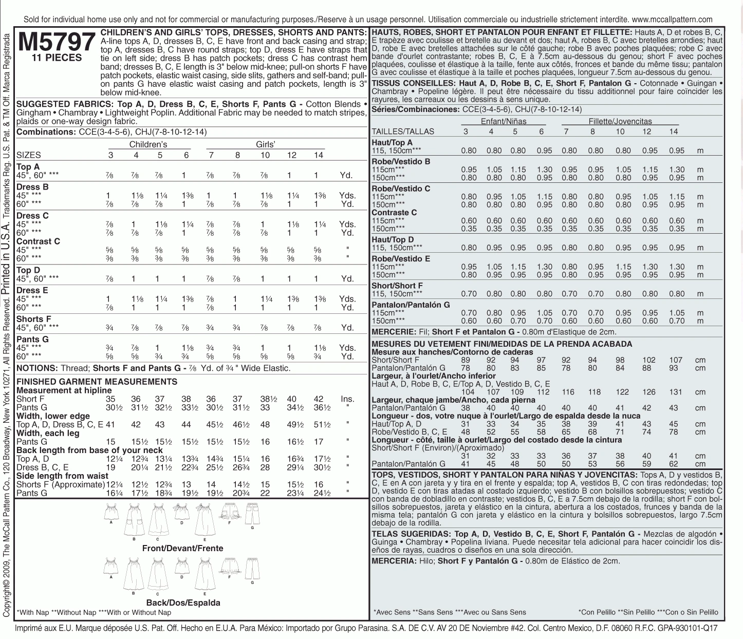 McCall’s Pattern M5797 Children’s/Girls’ Tops, Dresses, Shorts And Pants