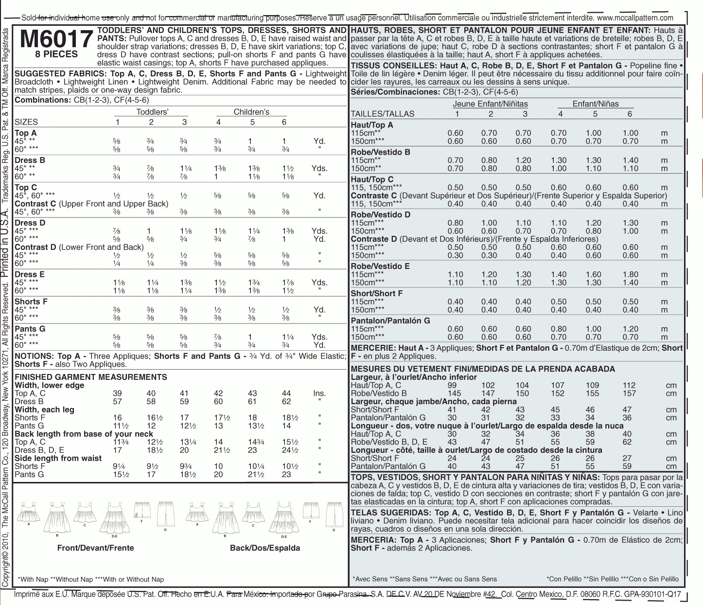 McCall’s Pattern M6017 Toddlers’/Children’s Tops, Dresses, Shorts And Pants