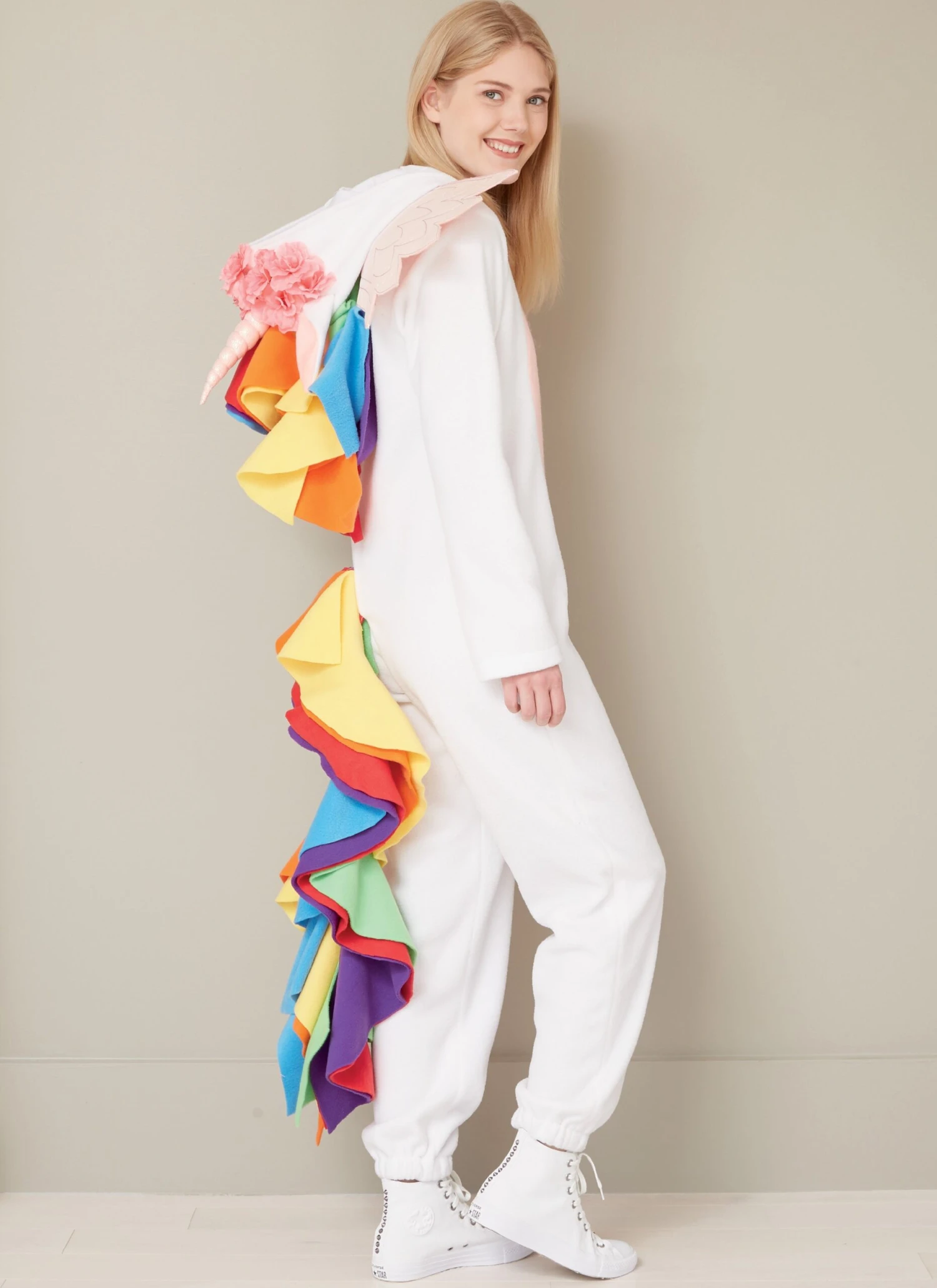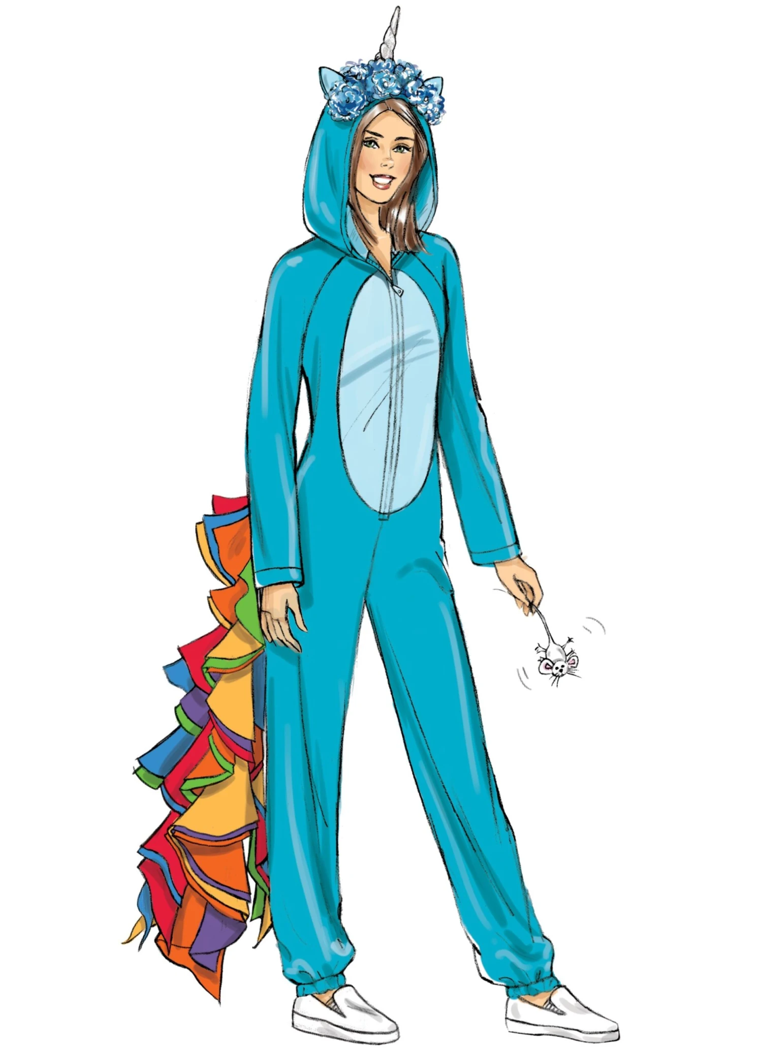 Loose-fitting jumpsuit with lined hood has front zipper, ear, tail and fabric variations. A: Tail in six colors. b: Tail in six colors, wings and horn overlay. C: Contrast ears, sleeves and tail. All have purchased flowers.