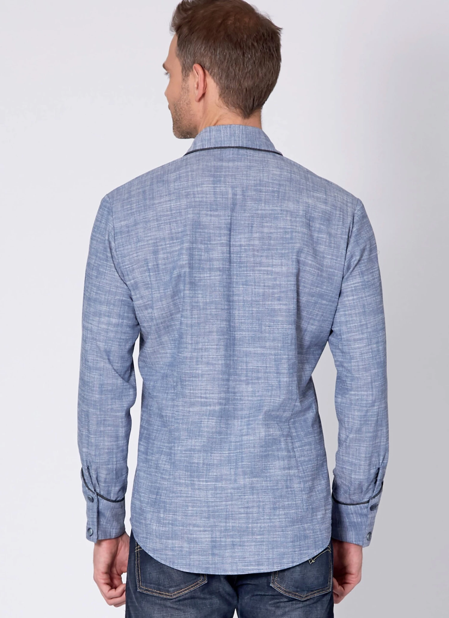 Semi fitted shirt has yoke variations, collar, collar band and patch pockets with buttoned flaps. B, D: Purchased piping trim. D: Purchased appliques.