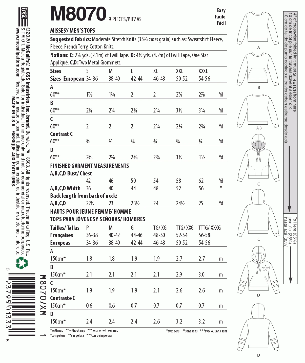 - Fabric needed: Moderate Stretch Knits (35% Cross Grain): Sweatshirt Fleece, Fleece, French Terry, Cotton Knits.