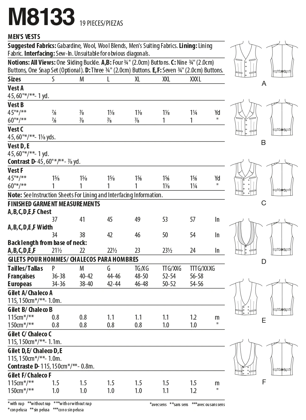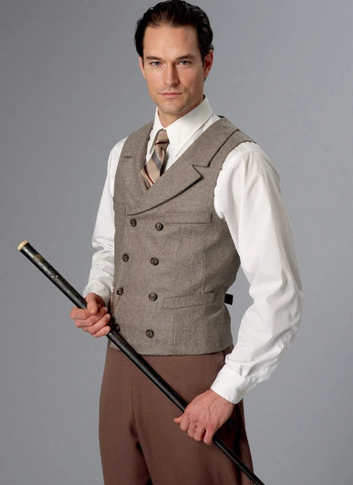 A man’s suit always came with a vest. Close-fitting, partially interfaced, lined, single & double-breasted vests have front extending to upper & side back, no shoulder or side seams, welt pockets, & back & belt cut of lining fabric.