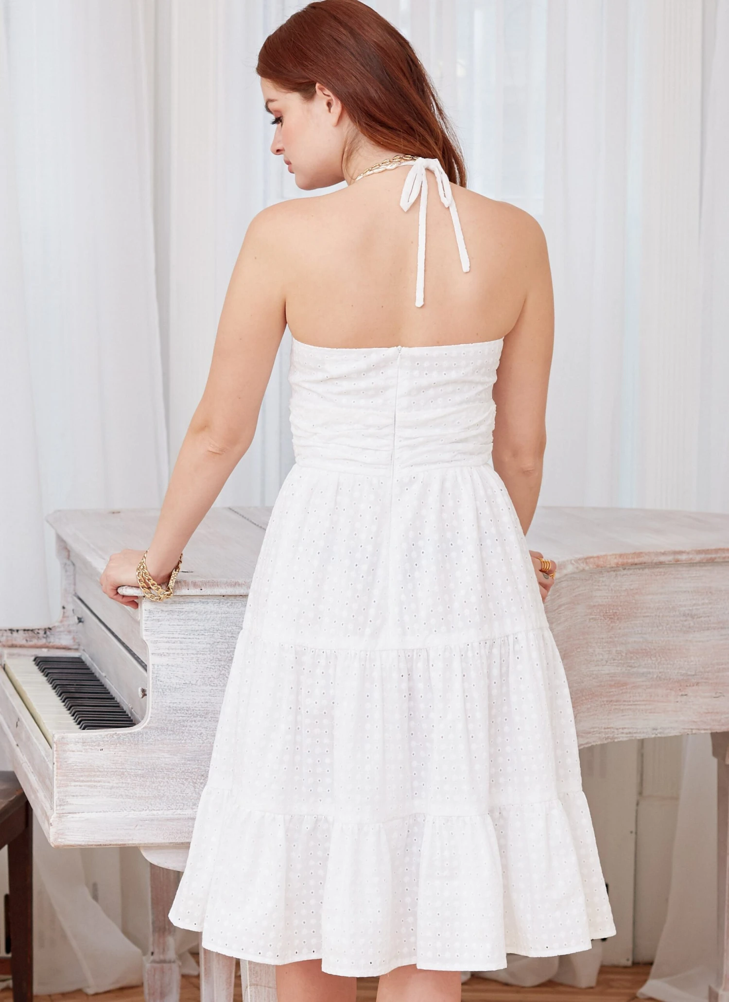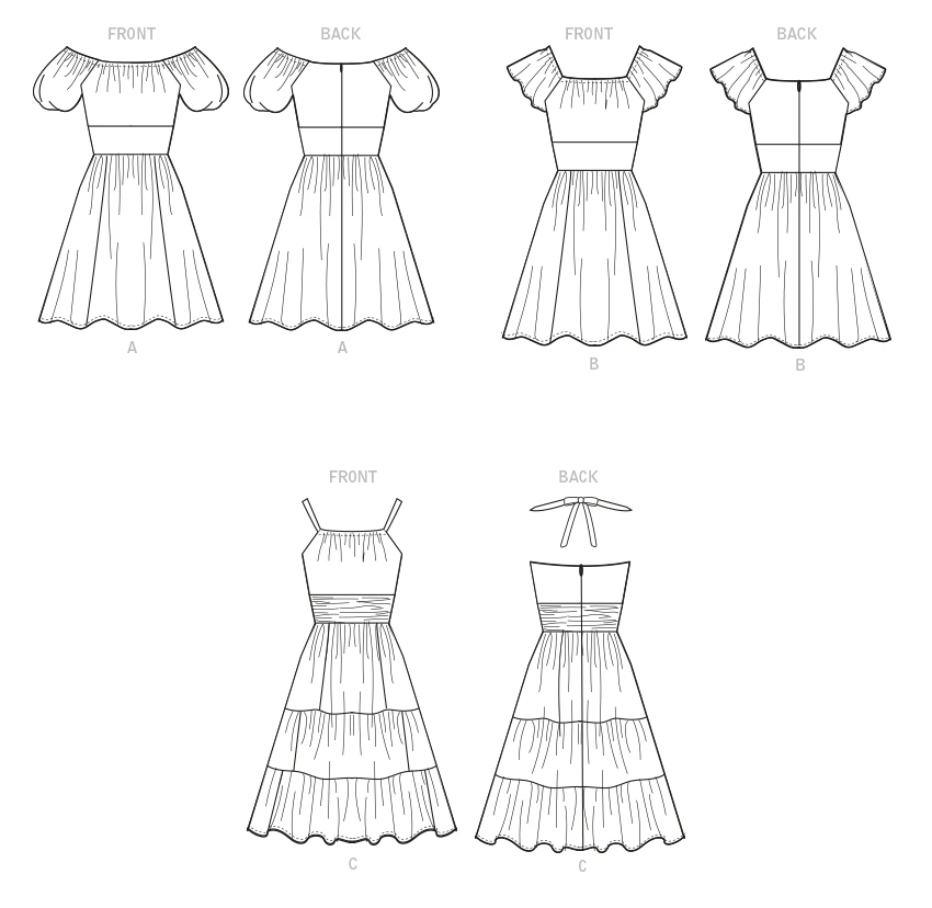 Misses’ & women’s gathered fit & flare dresses. A, B: elasticized necklines with puff & ruffle sleeve. C: halter dress with tiered skirt.