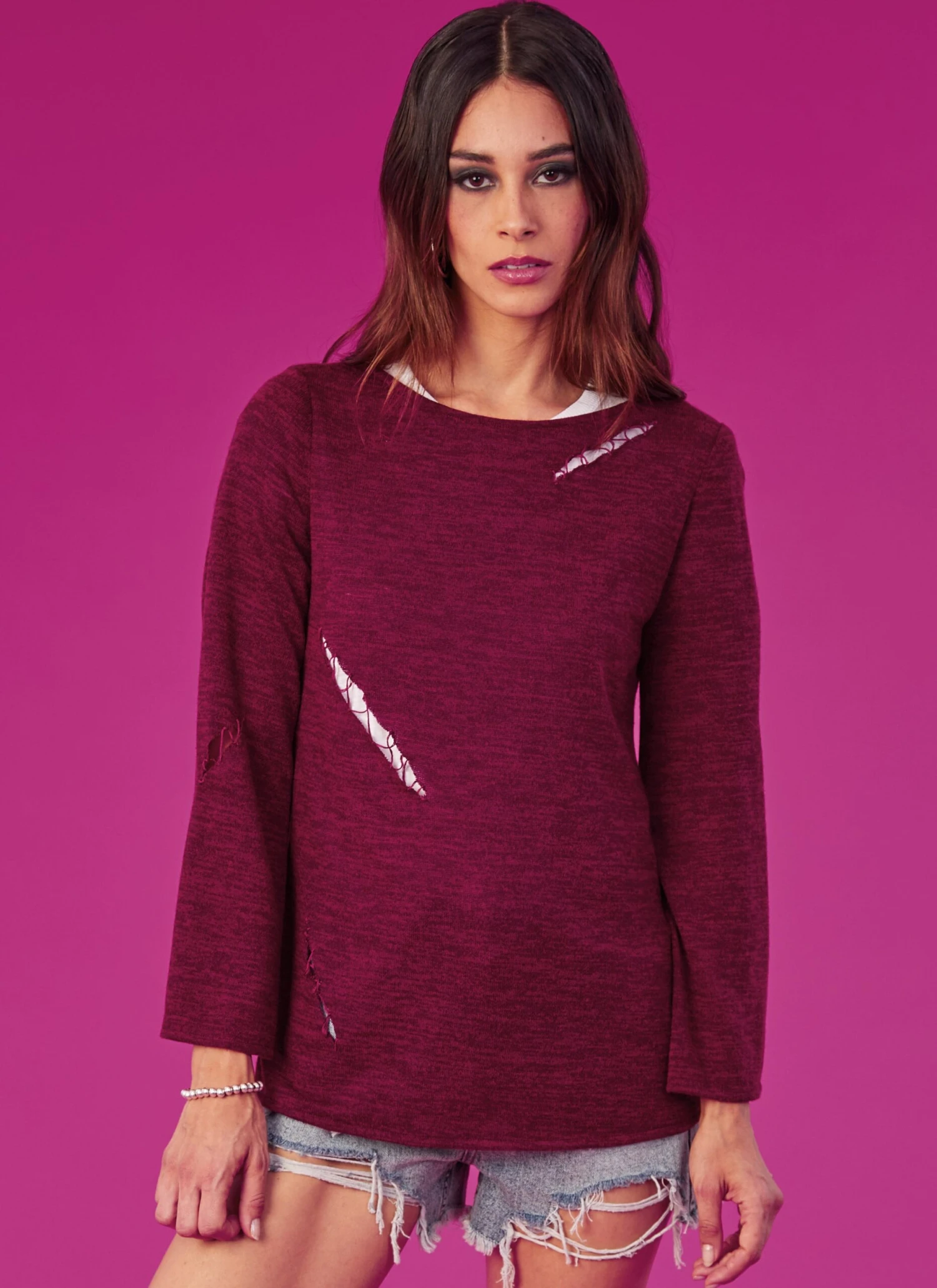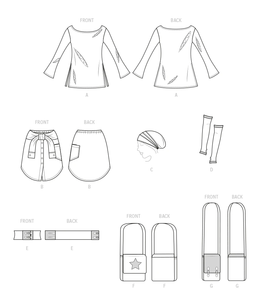Knit tunic with wide neck and extra long bell sleeves have slashes with floss stitches. Pull-on skirt with elastic waist has shirttail hem, front “sleeve” ties, pocket and button trim. Slouchy knit hat has tucked detail. Wide elastic belt has fabric tabs, buckle closures and chain trim. Long fingerless gloves have contrast bands. Messenger-style bags have flaps with painted or appliqued star or buckle closures.