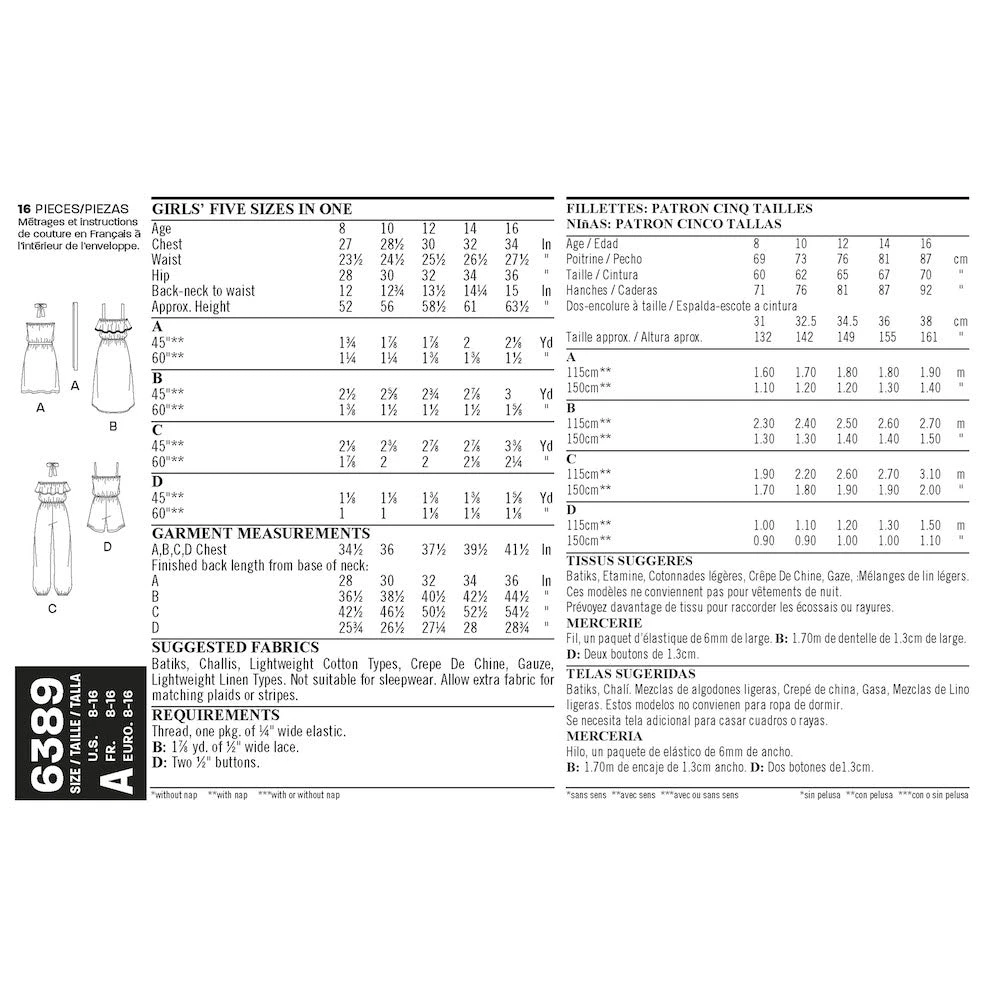 - Girls’ pattern includes pull-on jumpsuit, romper, short dress, and high-low dress each with elastic waist.
