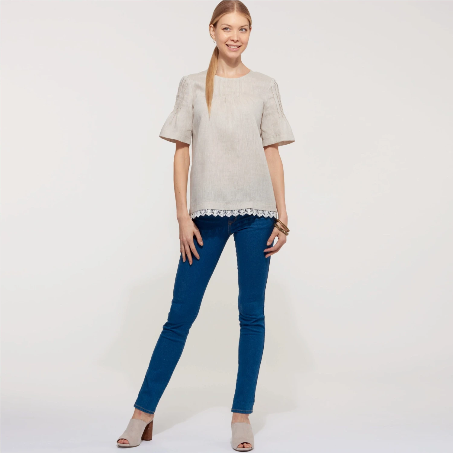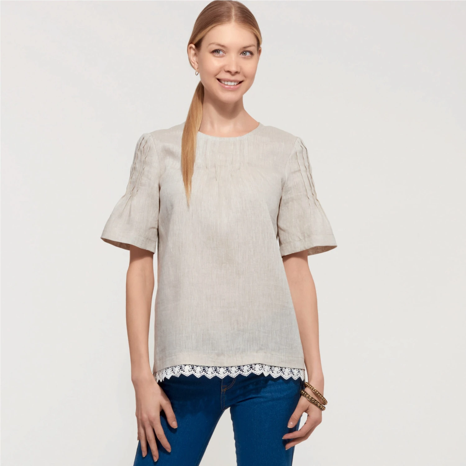 Loose-fitting top with stitched pleat detail at neckline and/or sleeves. View C has bow-trimmed sleeves and pleat detail from shoulder.