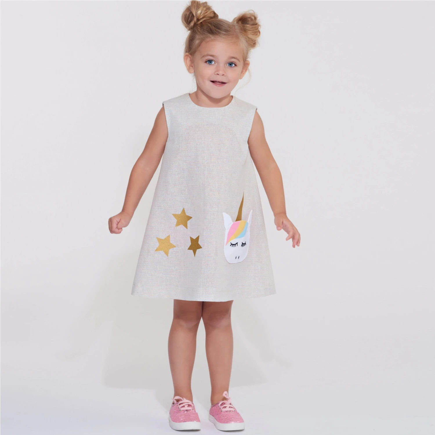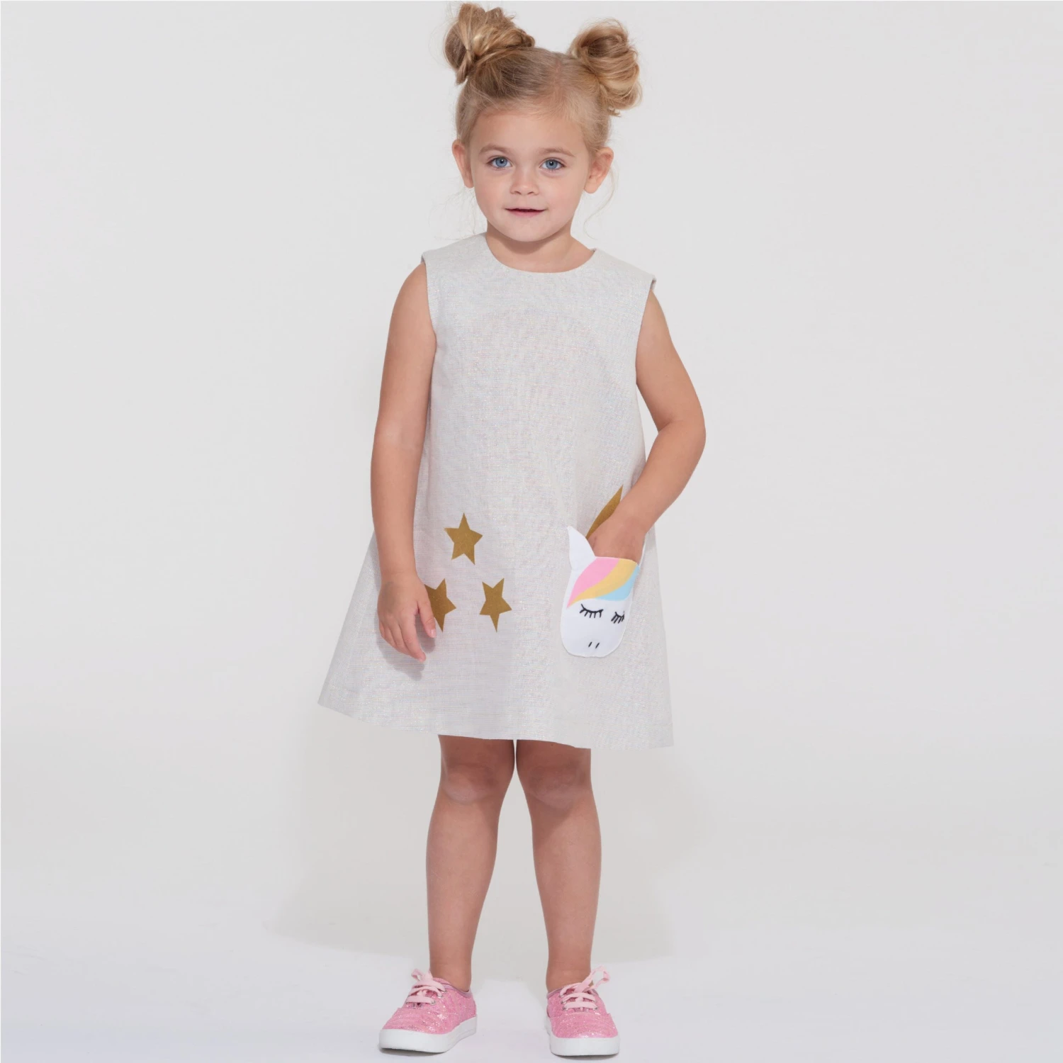 Childs’ slip-on dress fastens at back neck. With shaped novelty pockets and applique options. Sleeve length variations.