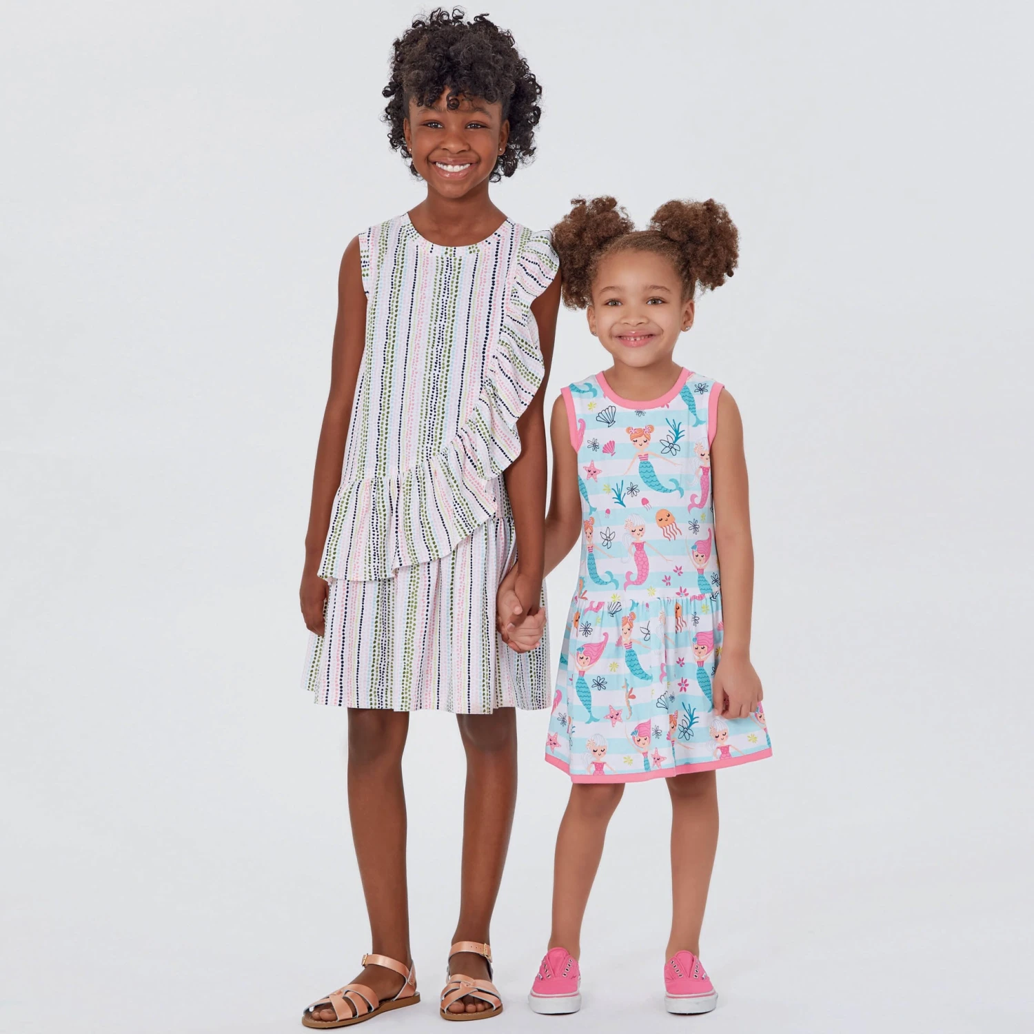 Children’s and Girl’s pull-on dresses with dropped waists.Front frill tim option. Back neck fastening. Pattern designed and sized for stretch knits fabrics.