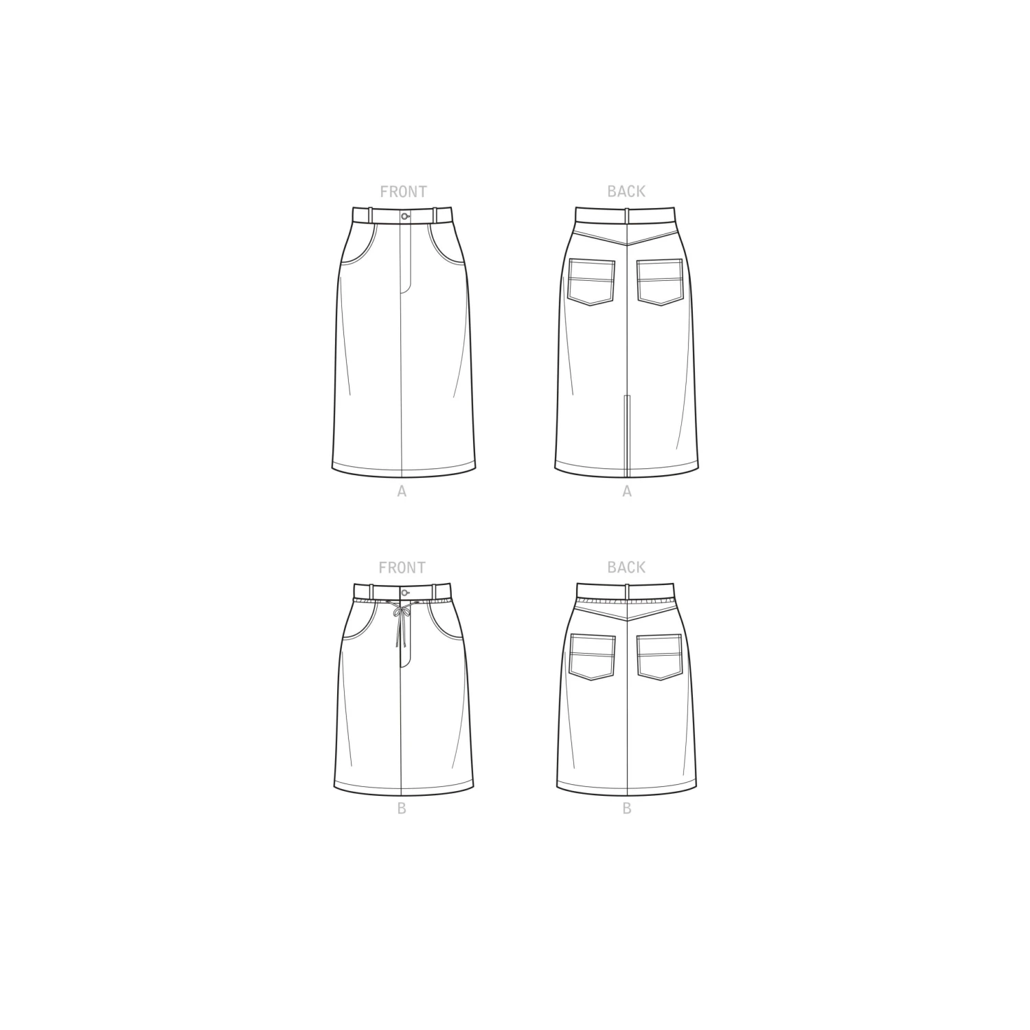 Misses’ jeans style skirts in two lengths with front pockets, back patch pockets and optional drawstring casing.