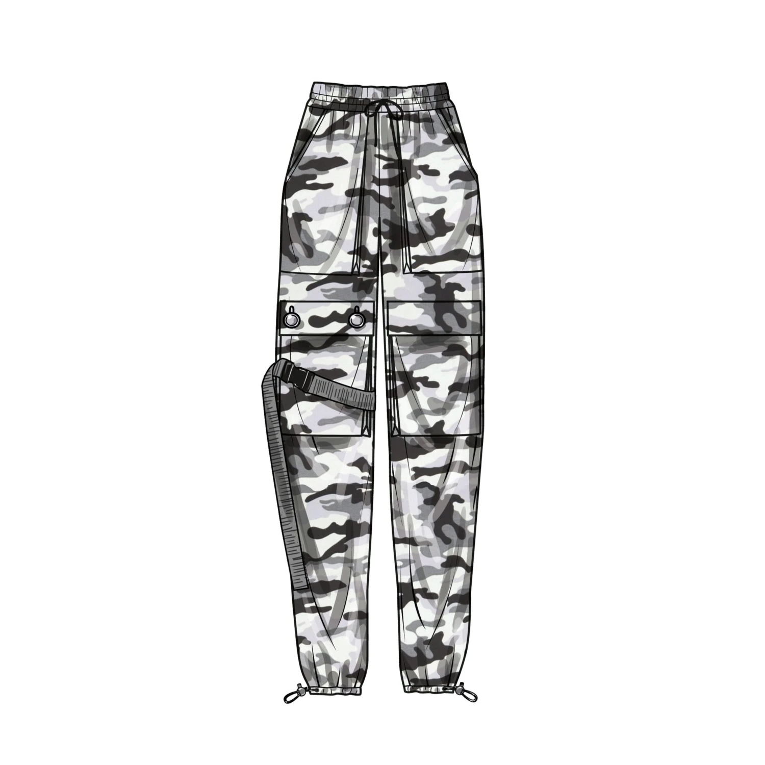Unisex cargo pants include bellows pocket with flap and drawstring at waistband. View A has front patch pockets, flat webbing with plastic parachute clip, and cord stoppers at the bottom of pants. View B has side seam pockets, patch on front, and nylon webbing plastic snap buckles.