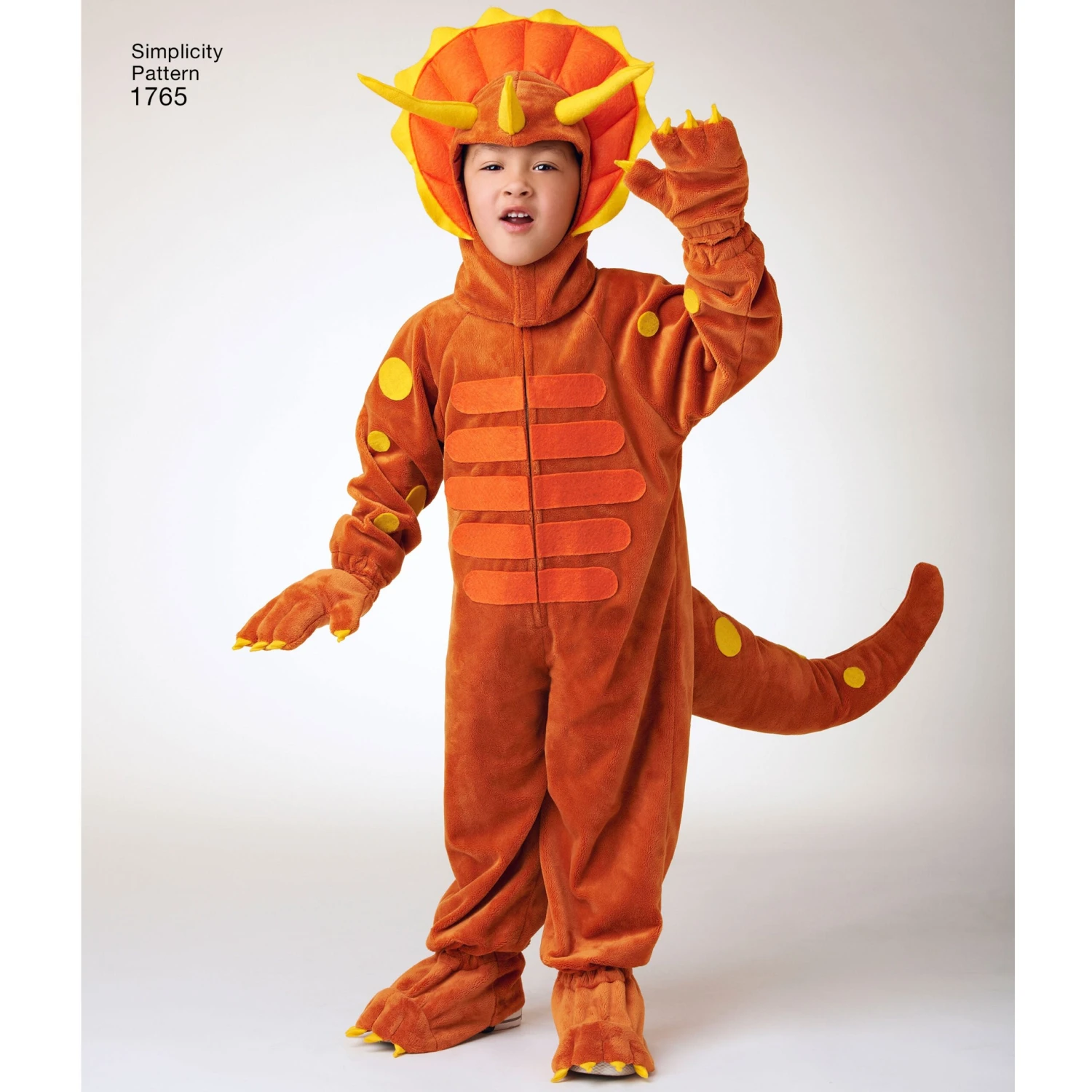 Child’s dinosaur and dragon costumes in sizes 3 to 8 plus dog dinosaur costumes in three sizes S (13″), M(15″), L(17″). Simplicity sewing pattern.