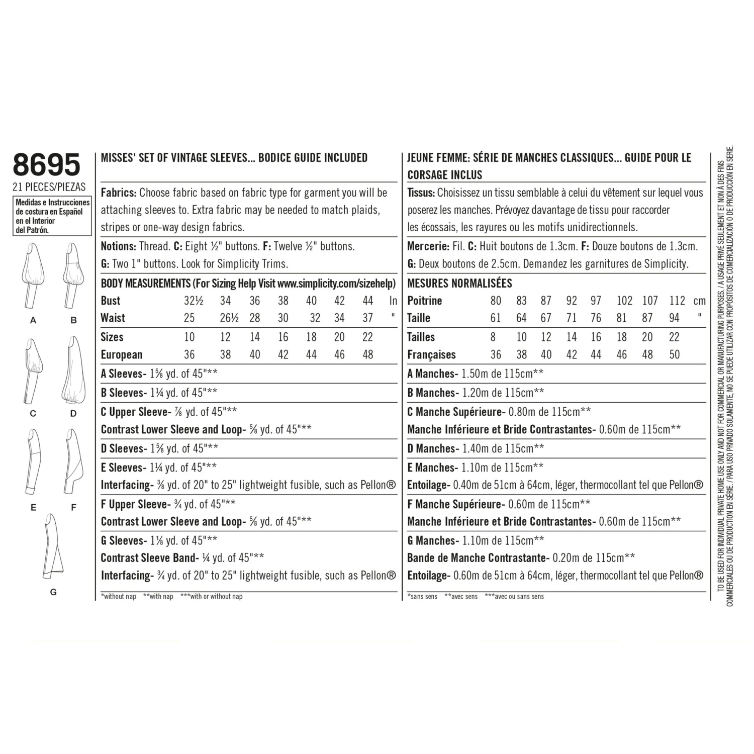 Simplicity Pattern 8695 Women’s Vintage Set Of Sleeves