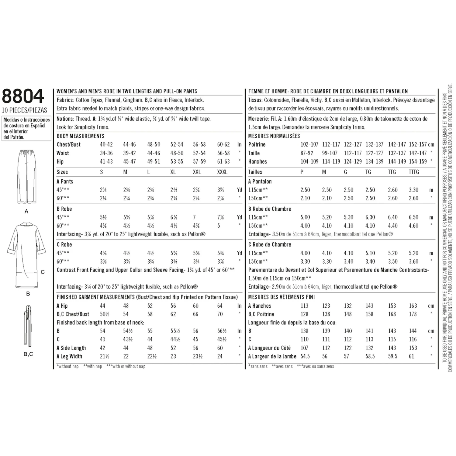 Simplicity Pattern 8804 Women’s And Men’s Robe And Pants