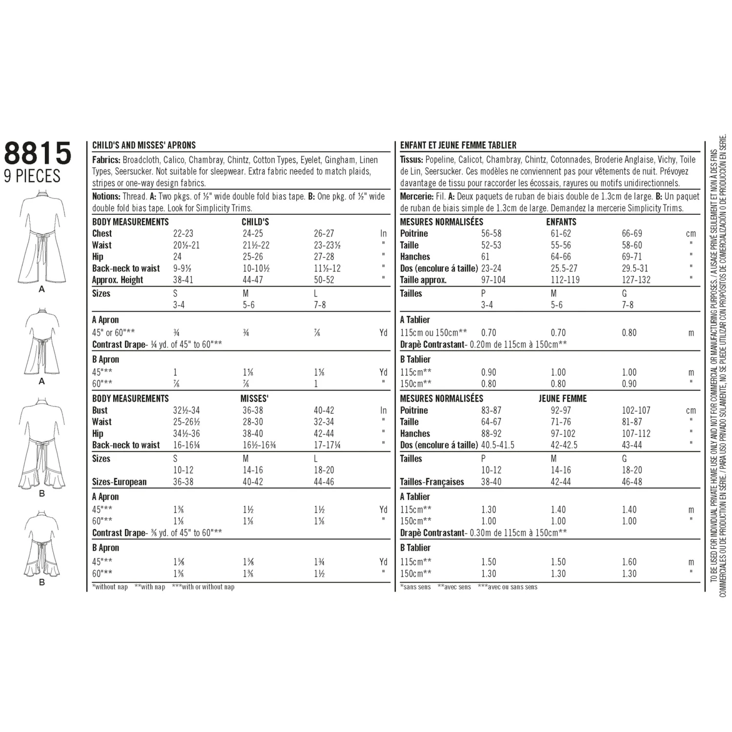 Simplicity Pattern 8815 Child’s And Misses’ Apron