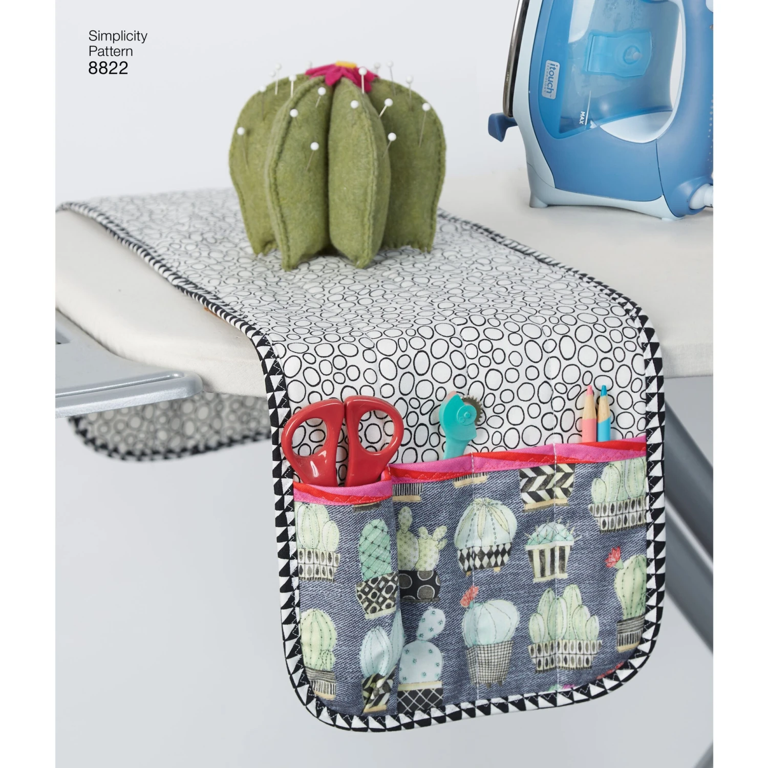 Sew in style with these fun sewing accessories pieces. Pattern includes Sewing mat/ sewing machine cover, ironing board organizer, iron caddy with iron board fabric inside and cactus pin cushions. Carla Reiss Design for Simplicity.