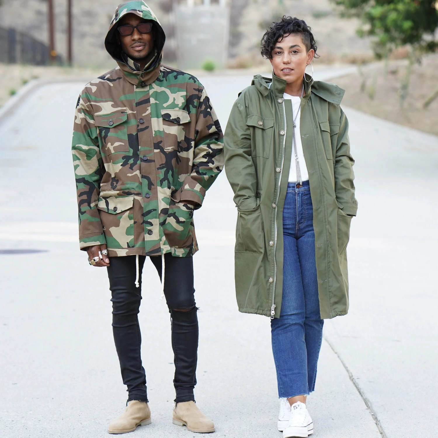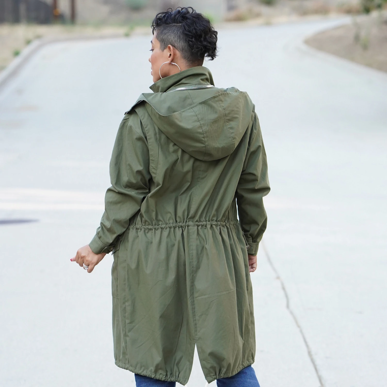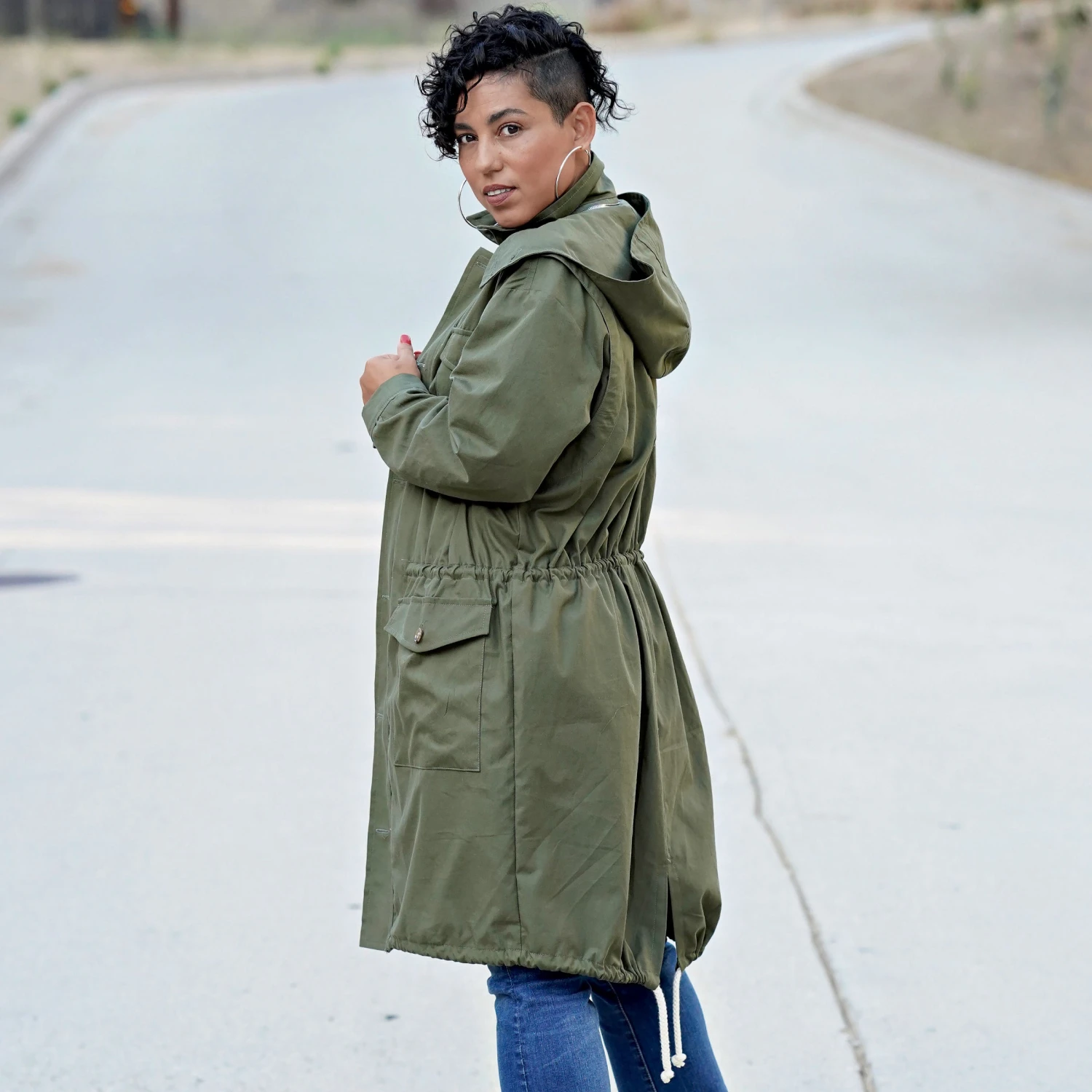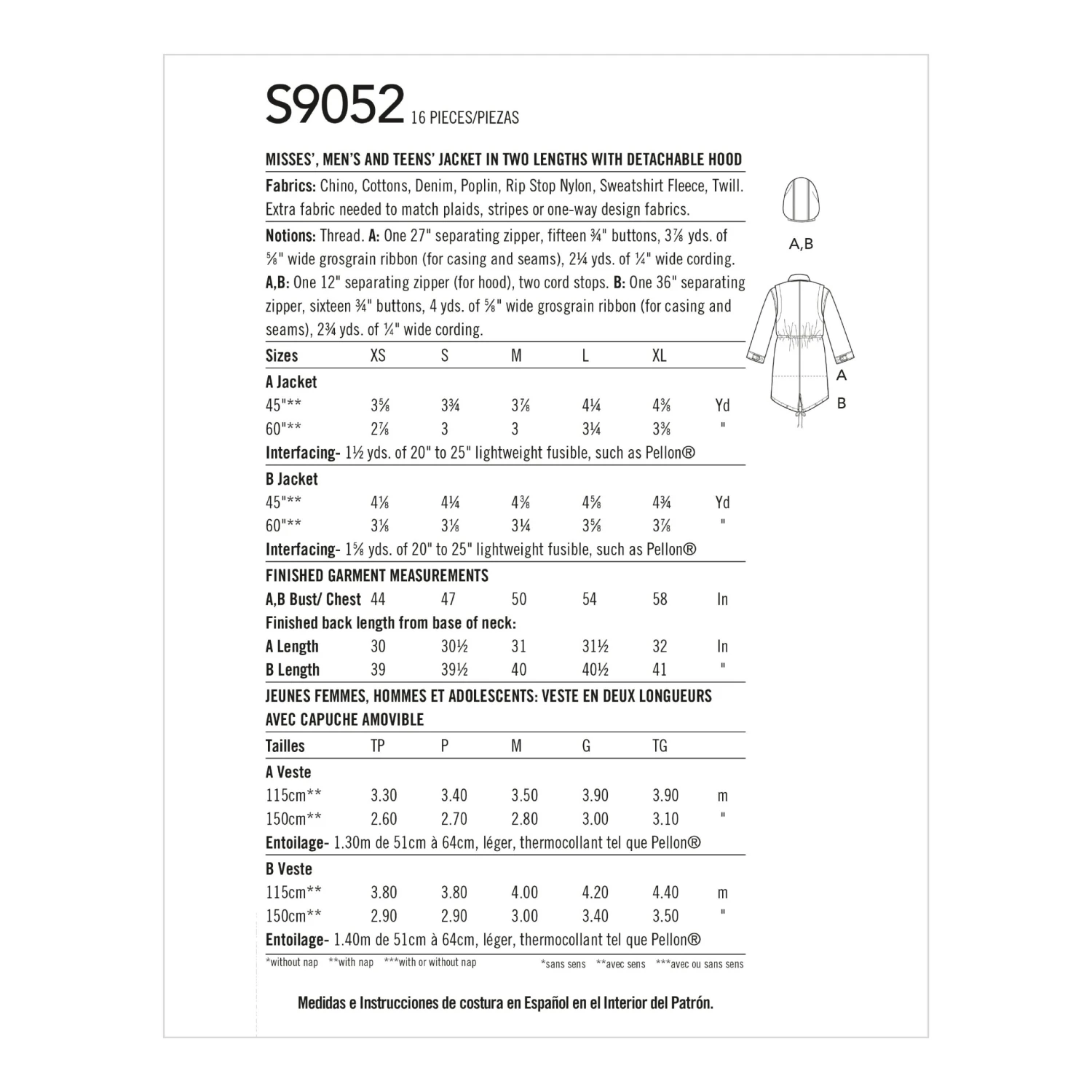 Simplicity Sewing Pattern S9052 -A (XS-S-M-L-XL)-Misses’ Men’s and Teen’s Jacket. Unlined combat or parka jacket has front separating zipper and button placket, Elasticated waist, four front pockets. Two length and hem-style options. Detachable hood.