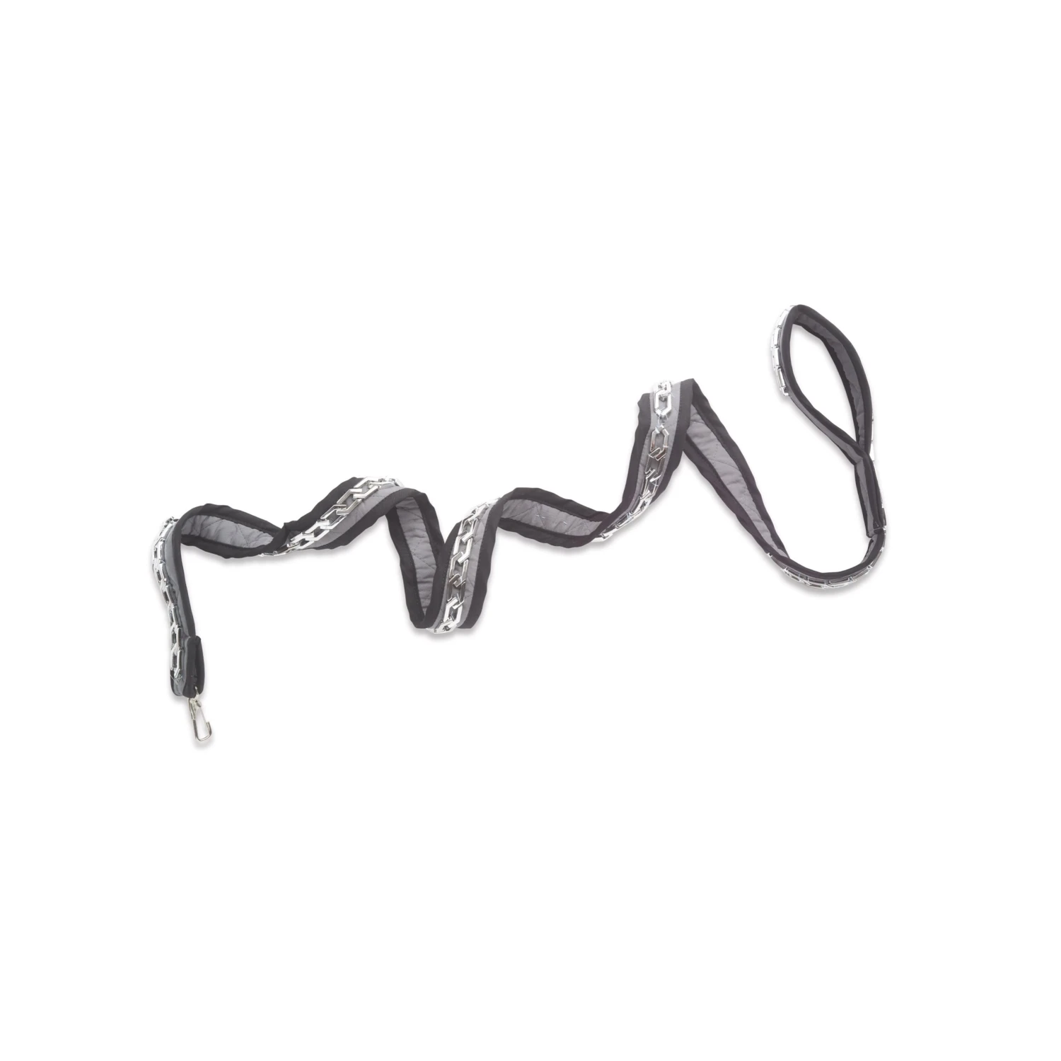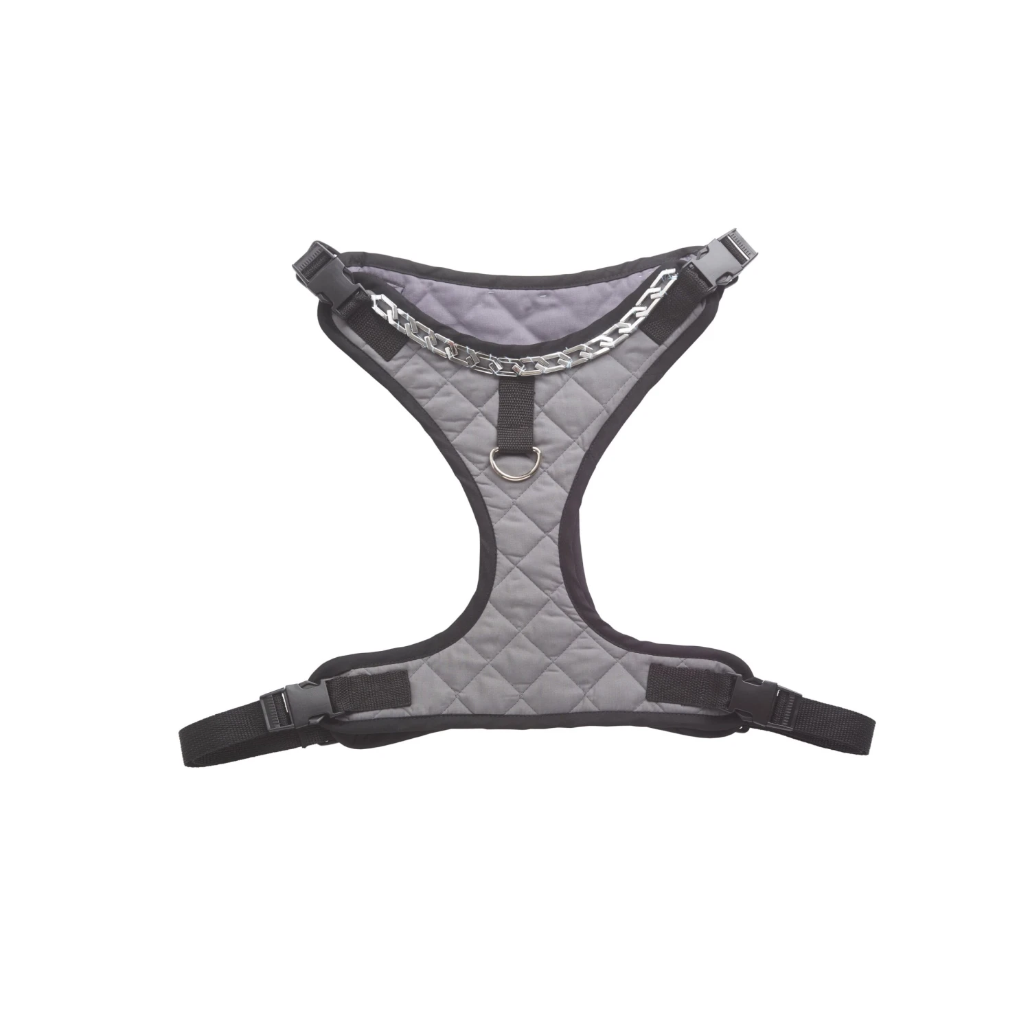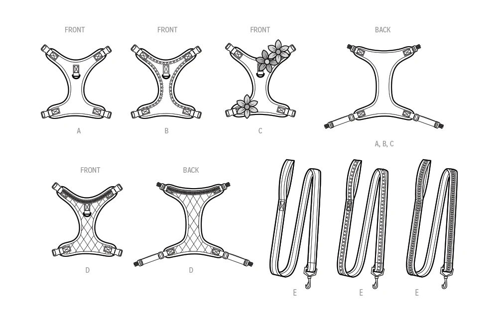 Lined, lightly padded harnesses with parachute clip closures, D-ring for leash attachment and edges finished with purchased binding have adjustable webbing straps at chest for a comfortable fit. 2″ (5cm) wide leash has snap hook, bound edges and looped handle. Harnesses and leashes have chain, decorative braid and fabric flower trim options. See envelope for more information.