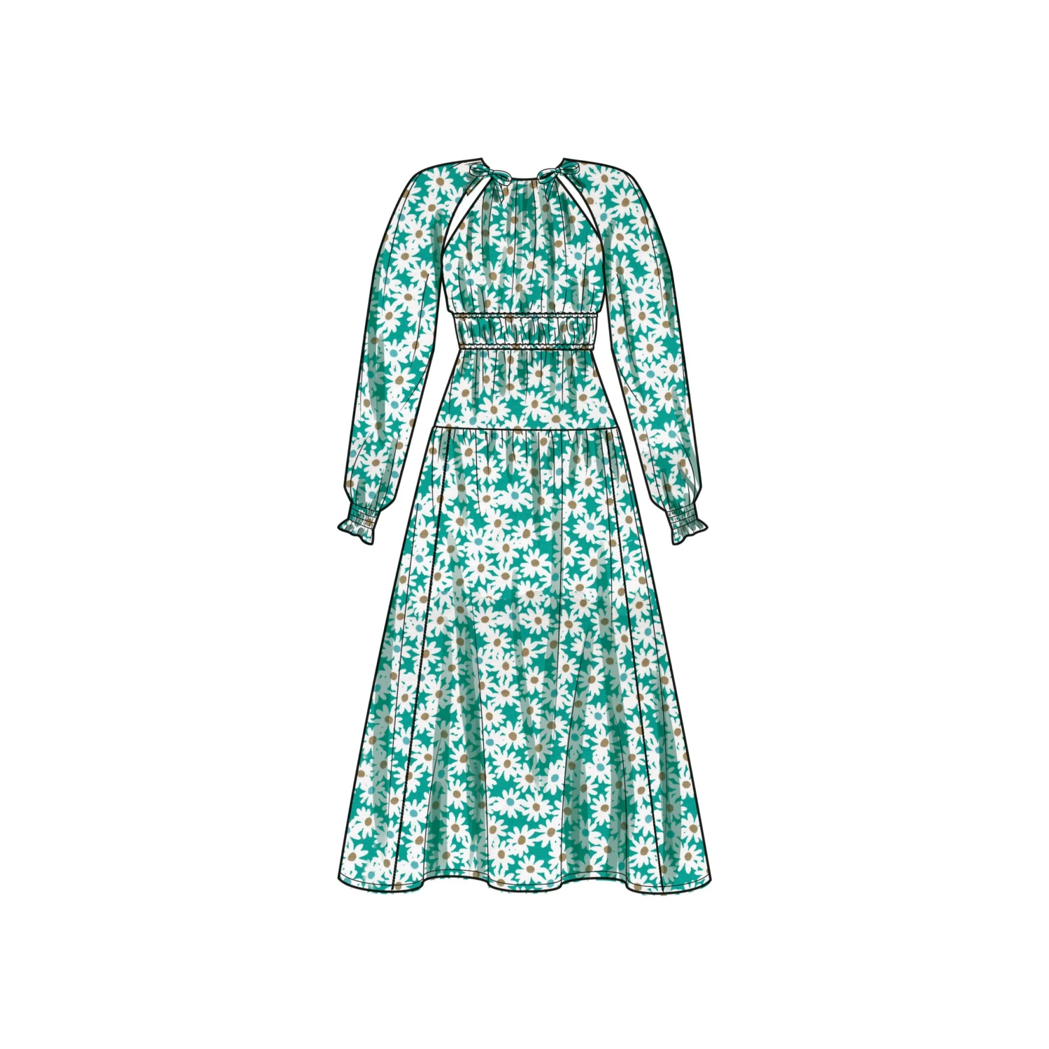 Dresses have gathers at neckline and raglan sleeves with variation for seam openings that tie close at neck. Gathers are created at waist with two rows of elastic casing. All feature tiered skirts available in two lengths and center back keyhole opening with hook and eye closure. Dress A has long sleeves with elastic gathers at wrist. Dresses B and C have flutter sleeves.