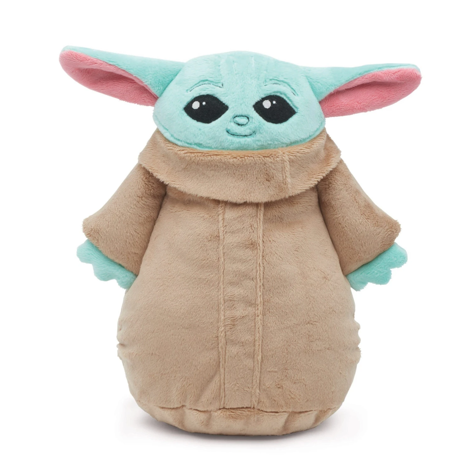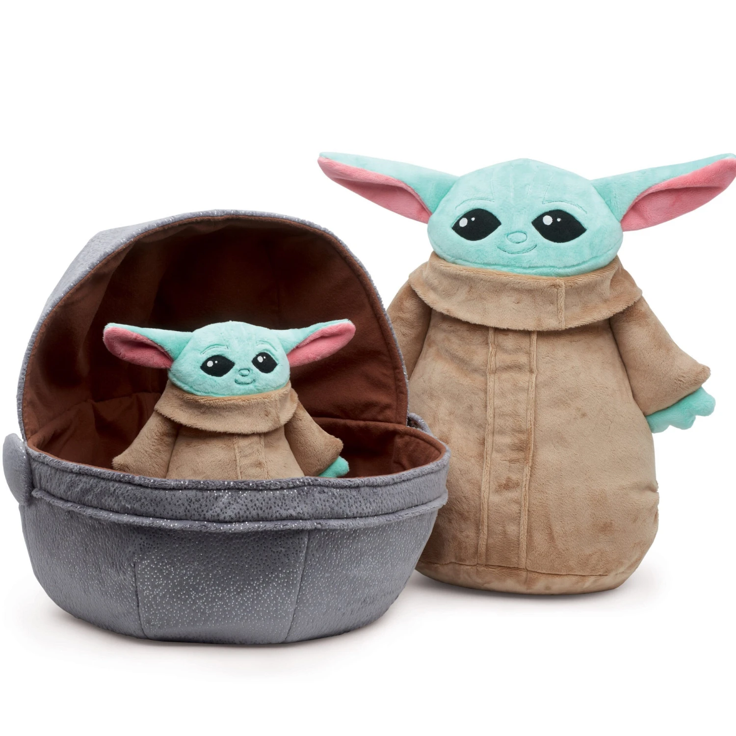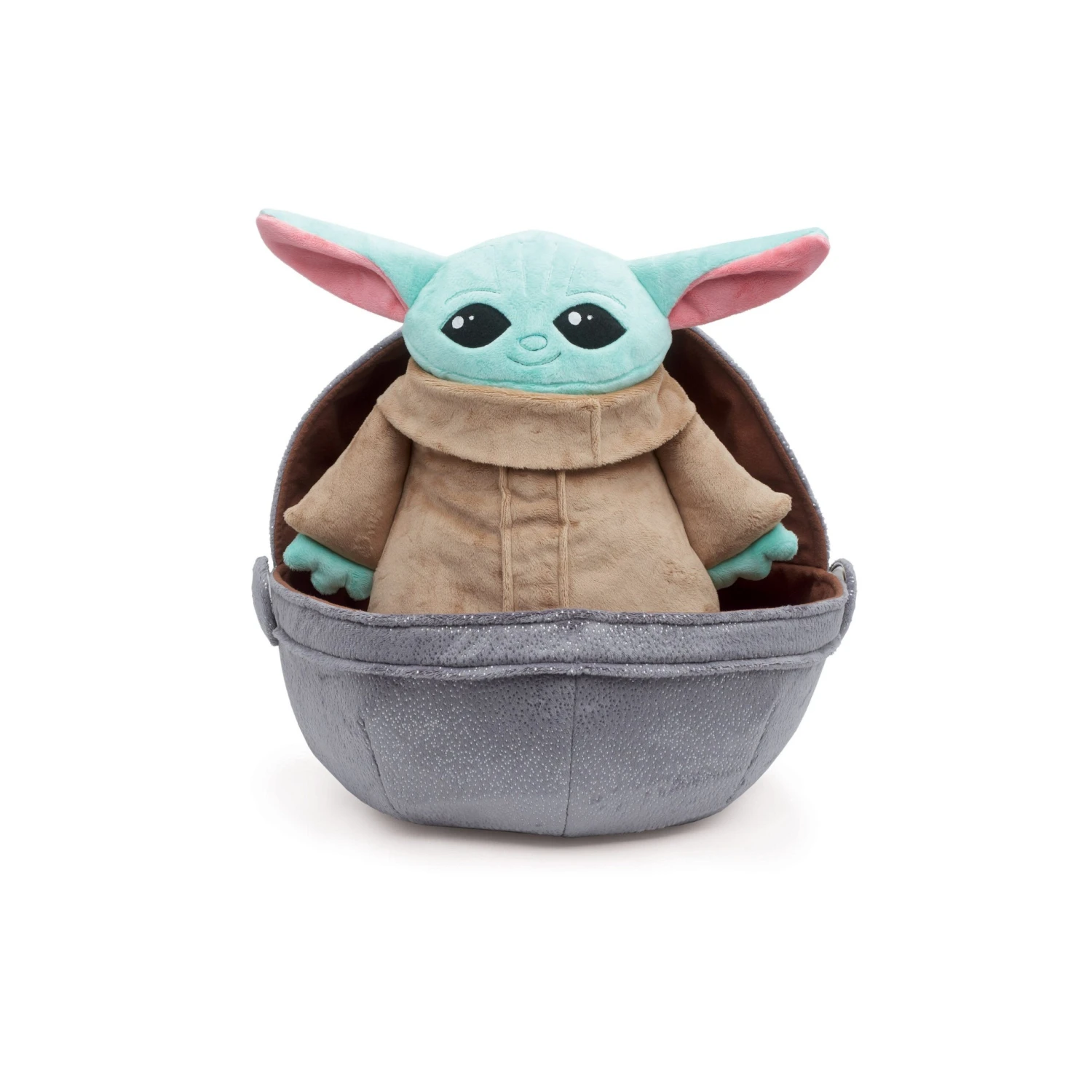 Cuddly soft Grogu in 21″ and 11″ heights have plush all-in-one body and head construction with stitched-in arms and 3D ears. With a round bottom and weighted with stuffing pellets, they stand alone or sit in a lined soft-sculpture space pram with covered button accents. Definitely Precious Cargo!