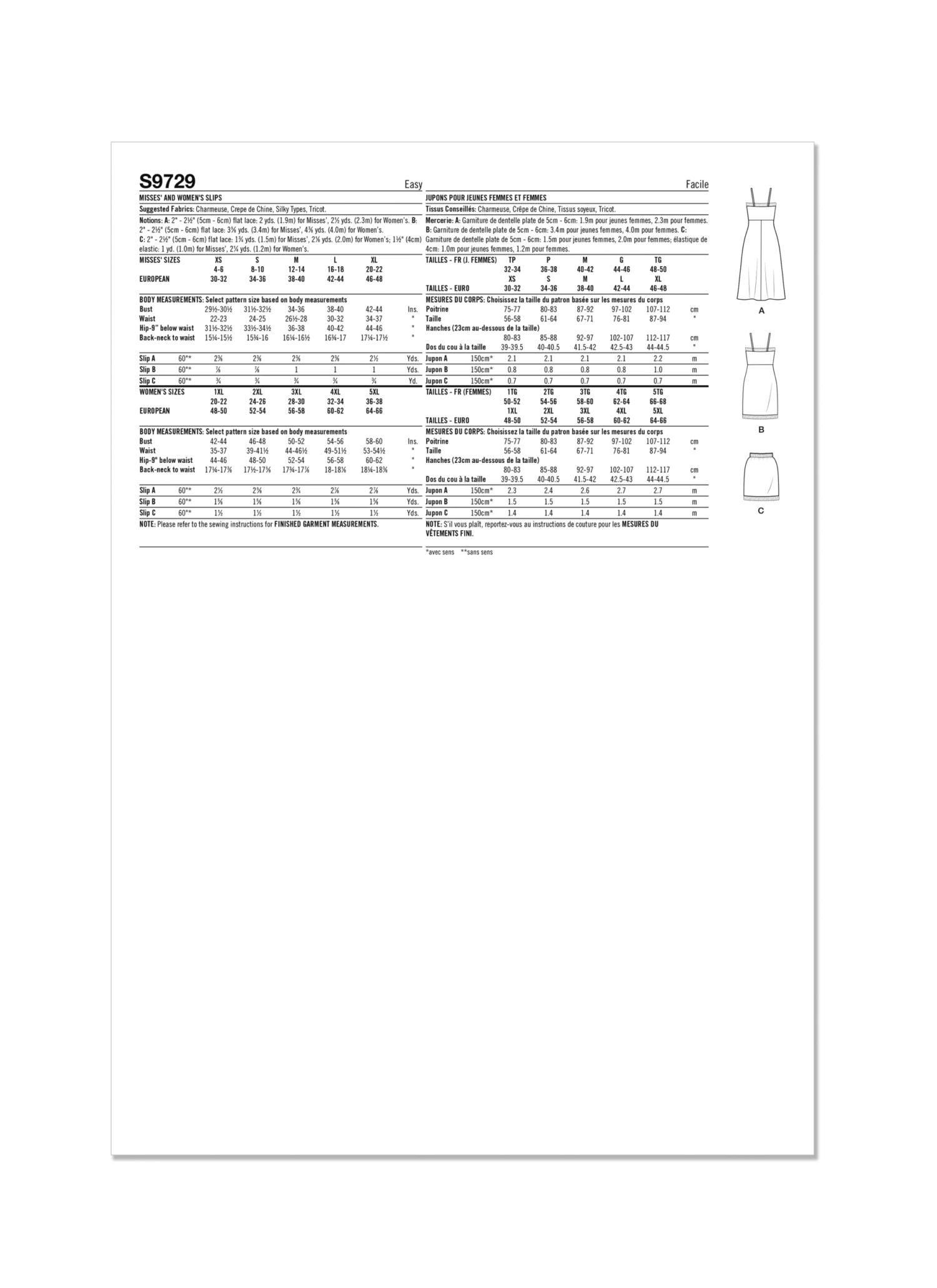 Pullover full slips with empire waistline and lace trim have calf-length flared skirt or above-knee length straight skirt. Pull-on above-knee length half slip has wide elastic waistline casing and lace trim. See envelope for more information.