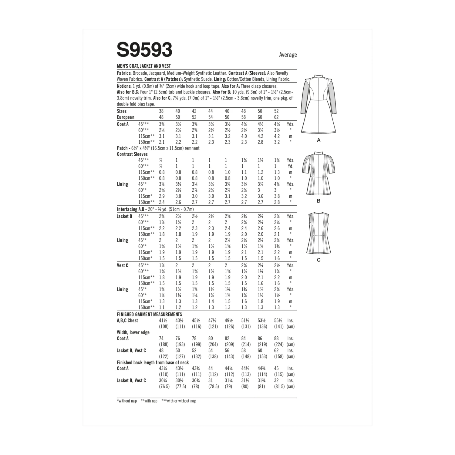 Simplicity Pattern SS9593 Men’s Coat, Jacket And Vest