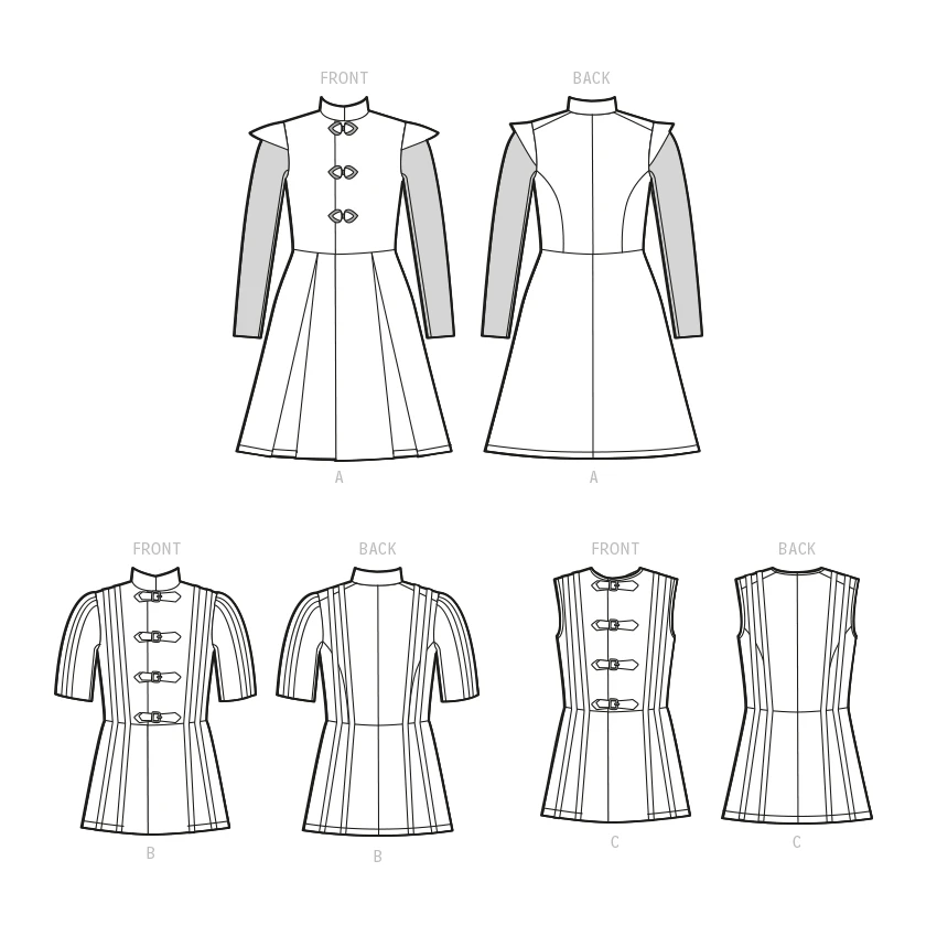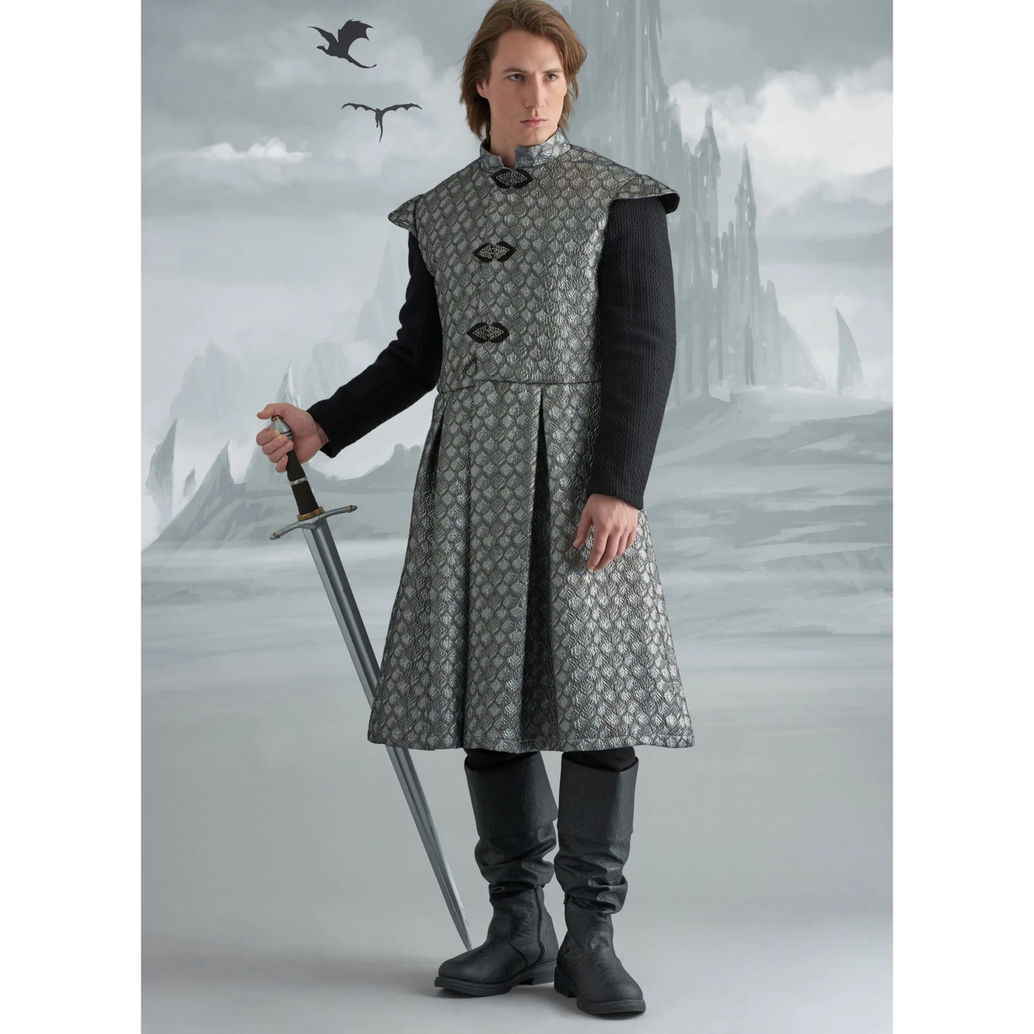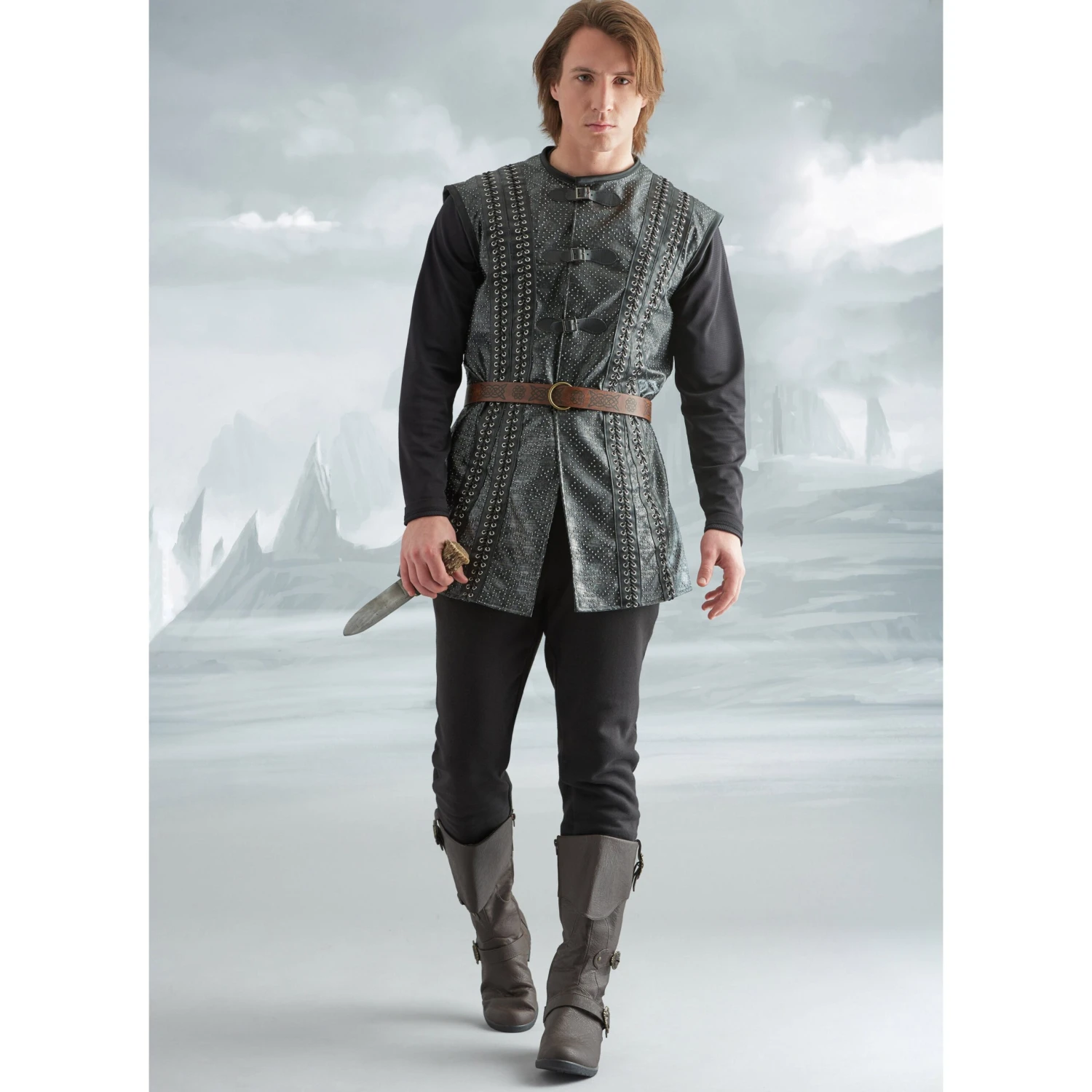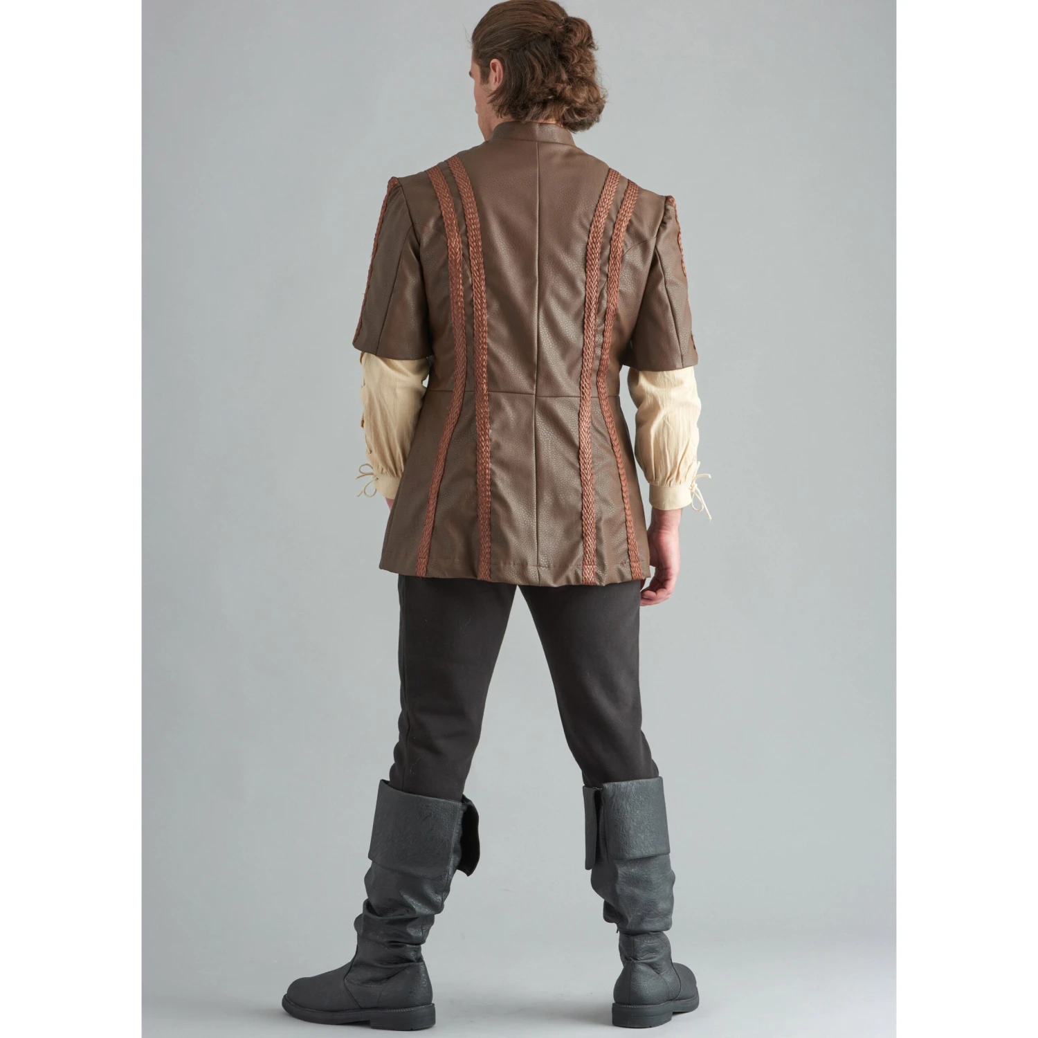 Medieval style costumes include coat and short sleeve jacket with collar and a collarless vest. Decorative trims mimic extra seaming on jacket and vest. Interesting tab and buckle closure finishes the look.