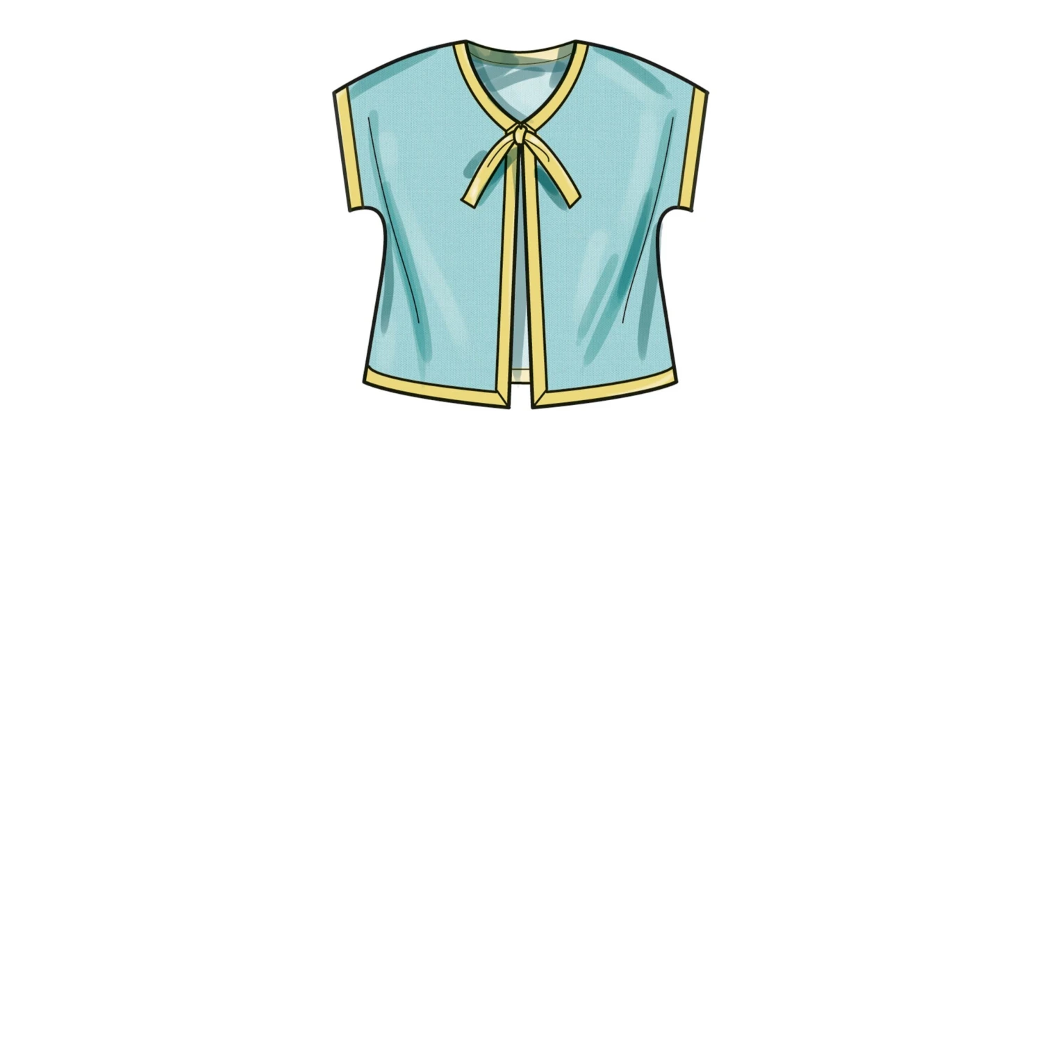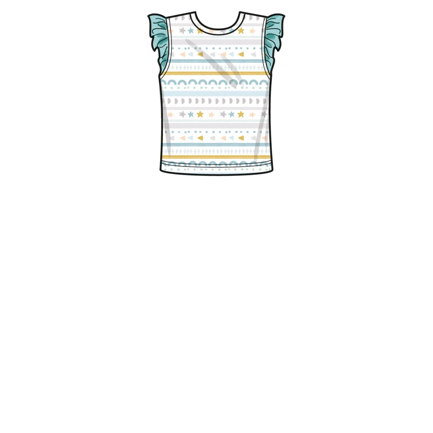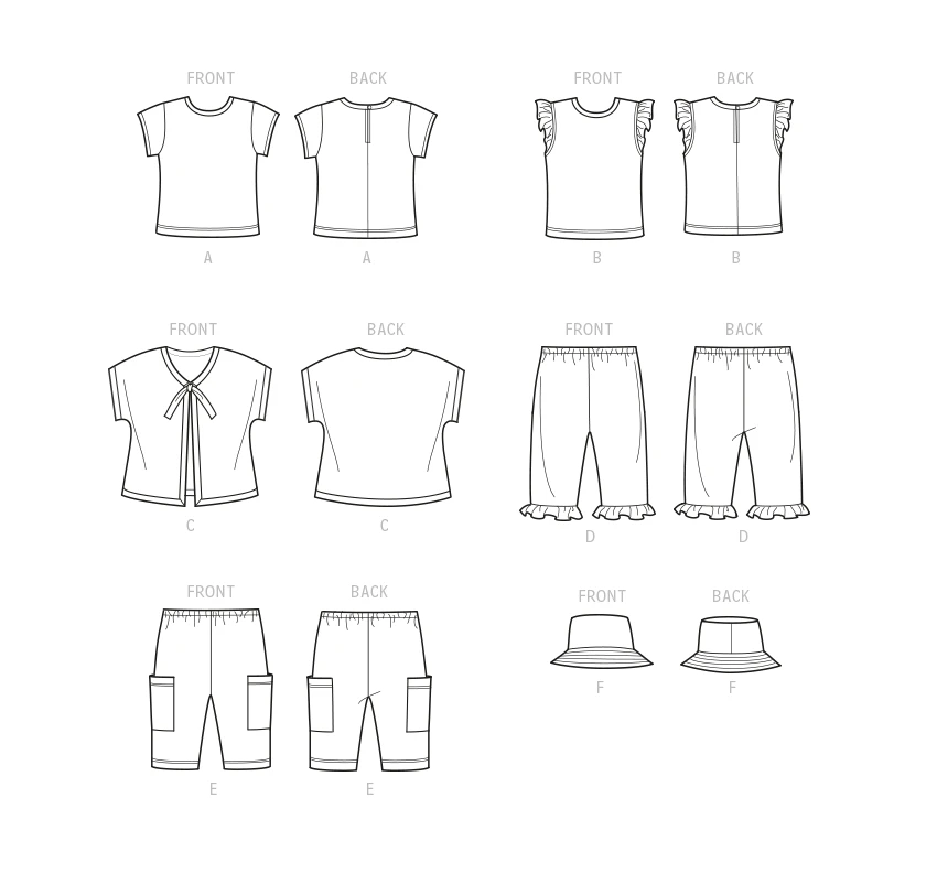 V-neck jacket with all-in-one sleeves is finished with bias tape. Pullover knit tee-shirts have short sleeves and sleeve ruffle variations. Pull-on pants have ruffle hem or cargo pockets. Bucket hat in three sizes S-M-L.