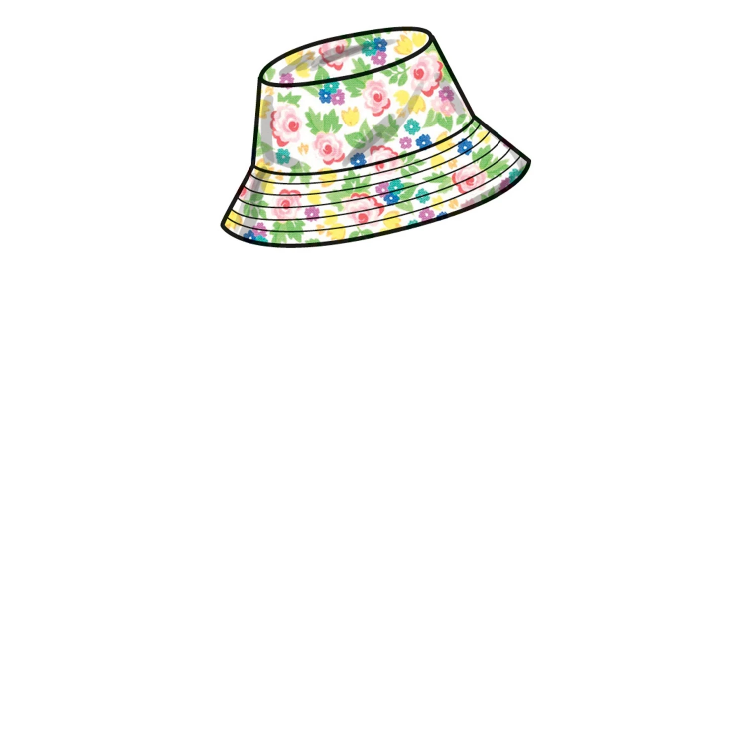 Step-in romper, jumpsuit and dress with button front shoulder tabs have pleats at waist and have front side pockets. Hat comes in four sizes.