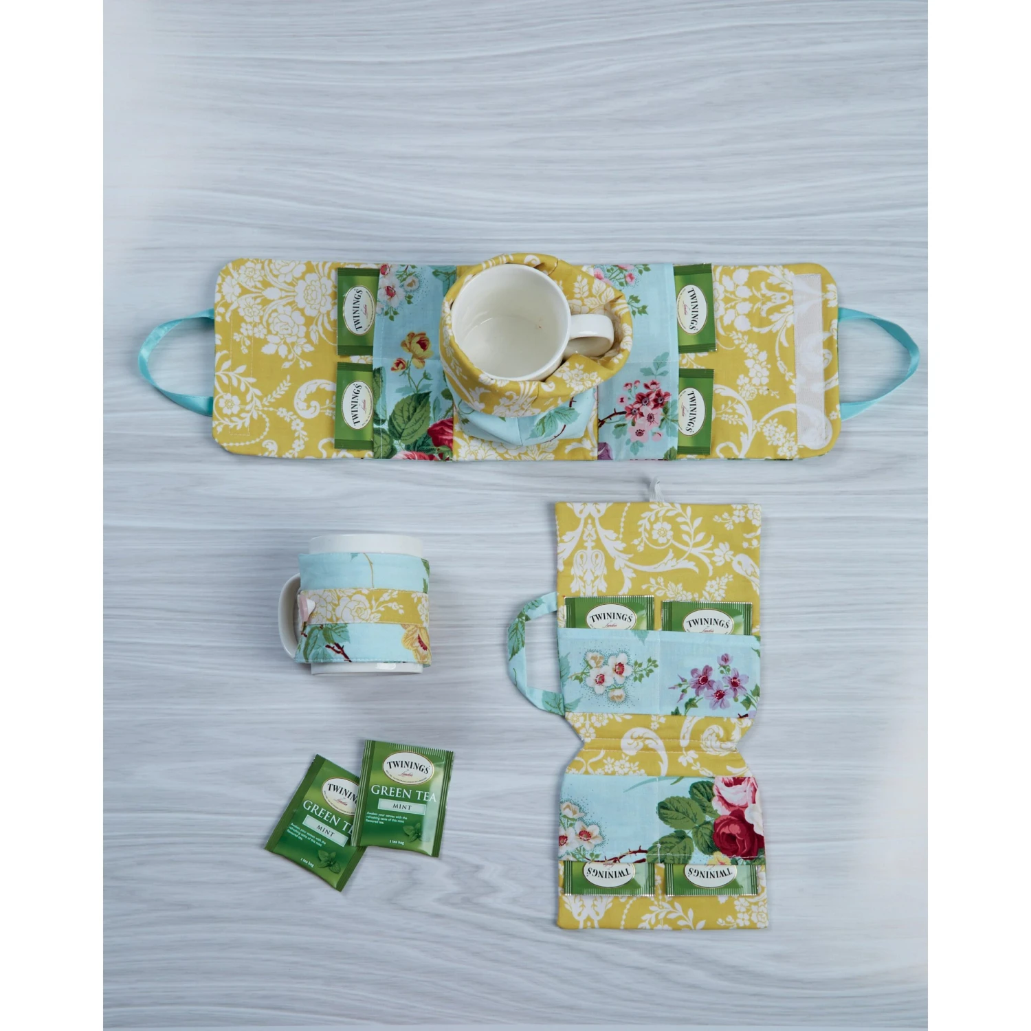 Use a mix of pretty prints for tea time accessories. Mug case with pockets for tea bags and sweetener is 5″ H (13cm) x 5.75″ W (14.6cm). Tea cup design tea bag case is 5″ H (13cm) x 6″ W (15cm). Mug cozy is 3″ H (7.5cm) x 11″ W (28cm).