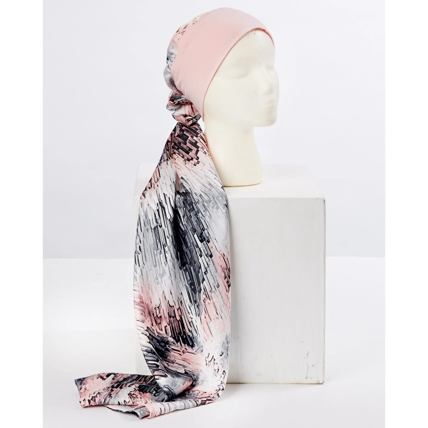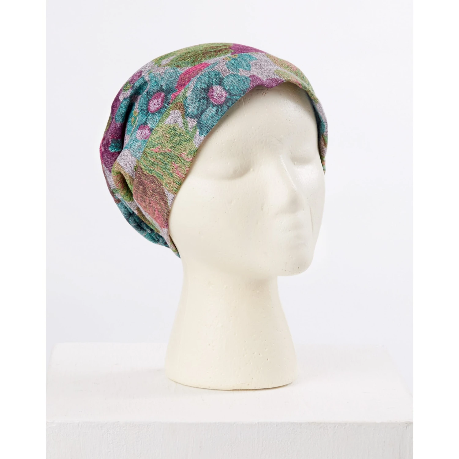 Soft knit, comfortable hats offer coverage to nape of neck. Headwrap has knit band with pretty print scarf.
