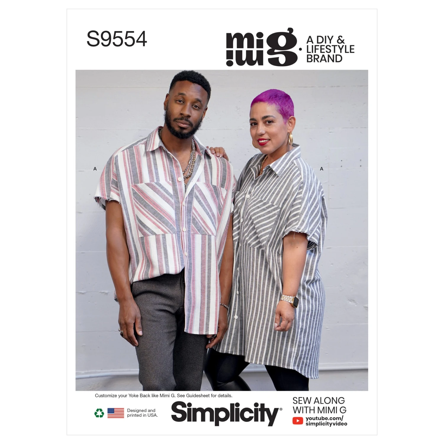 Relaxed fit button front shirt in two lengths has banded collar and oversized front pockets. Back has yoke, box pleat and loop.