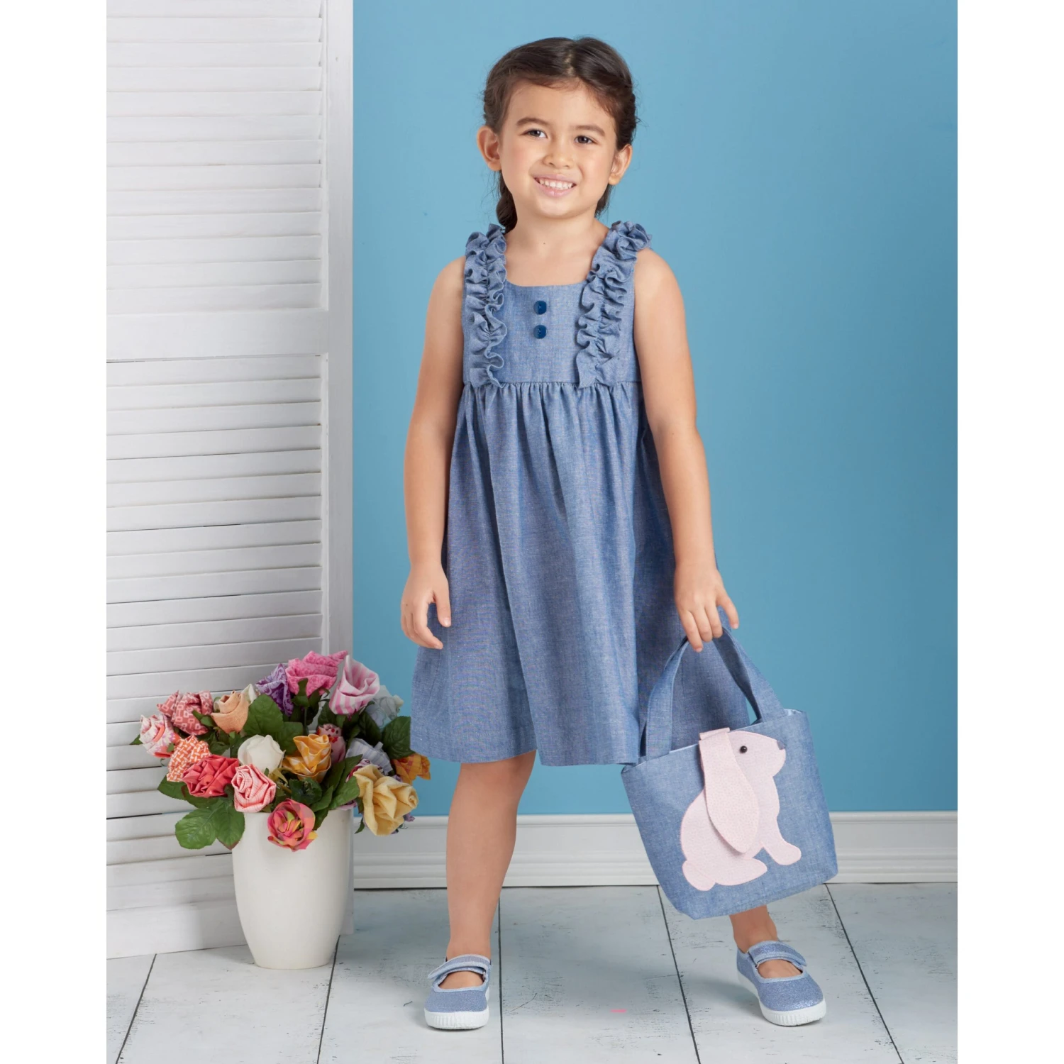 Dresses and top with lined bodice and back buttons have skirt gathered to empire waistline seam, fabric ruffles and button trim. Dress with or without short sleeves is below knee length; sleeveless top is hip length. Pull on cropped pants have fabric tie bows and elastic waist. Lined purses have ruffle or bunny details. Ruffled headband included.